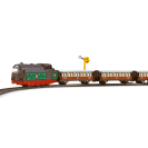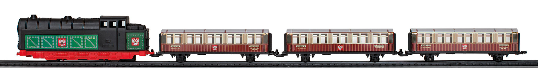 Kovový osobní vlak na baterie se skládá z lokomotivy se světlem a tří vagonů a jezdí po trati dlouhé 3,9 m. Součástí sady je i nádraží, návěstidlo a nakolejovač – pomůcka pro snazší nasazení vlaku na trať
