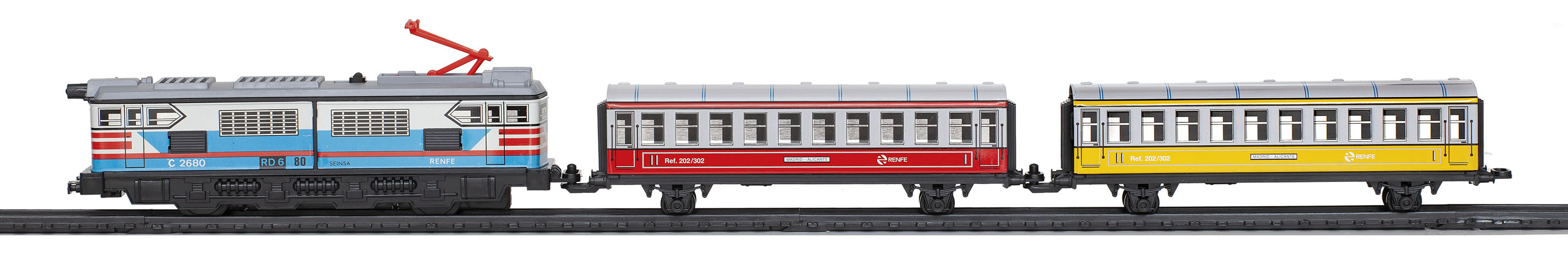 Popis produktu Pequetren 202 Osobní vlak barevnýKovový historický osobní vlak na baterie se světlem a 2 vagóny, který jezdí po trati dlouhé 2,94 m. Obsah balení: 1 lokomotiva se světlem 2 vagóny 12 obloukových kolejí Použijte 2 baterie 1,5 V (typ C – LR14) BATERIE NEJSOU SOUČÁSTÍ BALENÍ Součástí ceny je recyklační příspěvek 8,00 Kč bez DPH. SERVICIOS E INDUSTRIAS DEL JUGUETTE S.L.U., Avda del Juguete 17, 03440 Ibi, ES, info@pequetren.com
