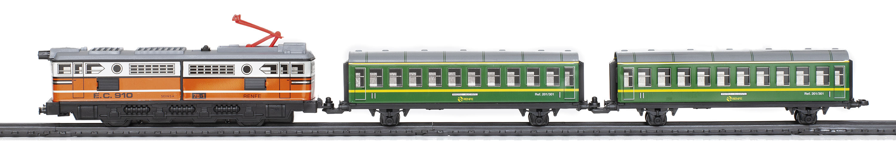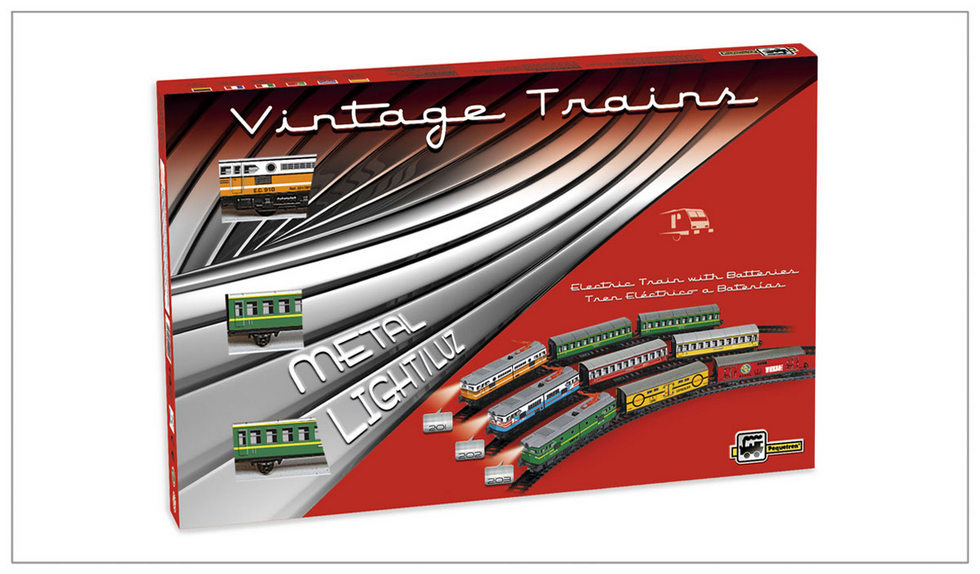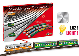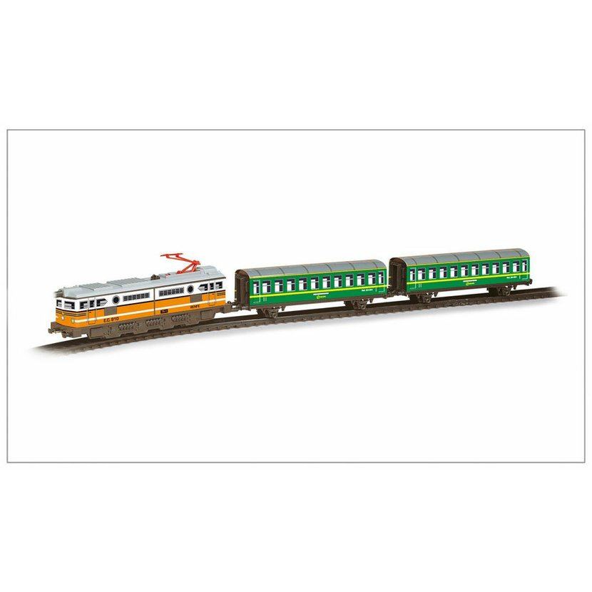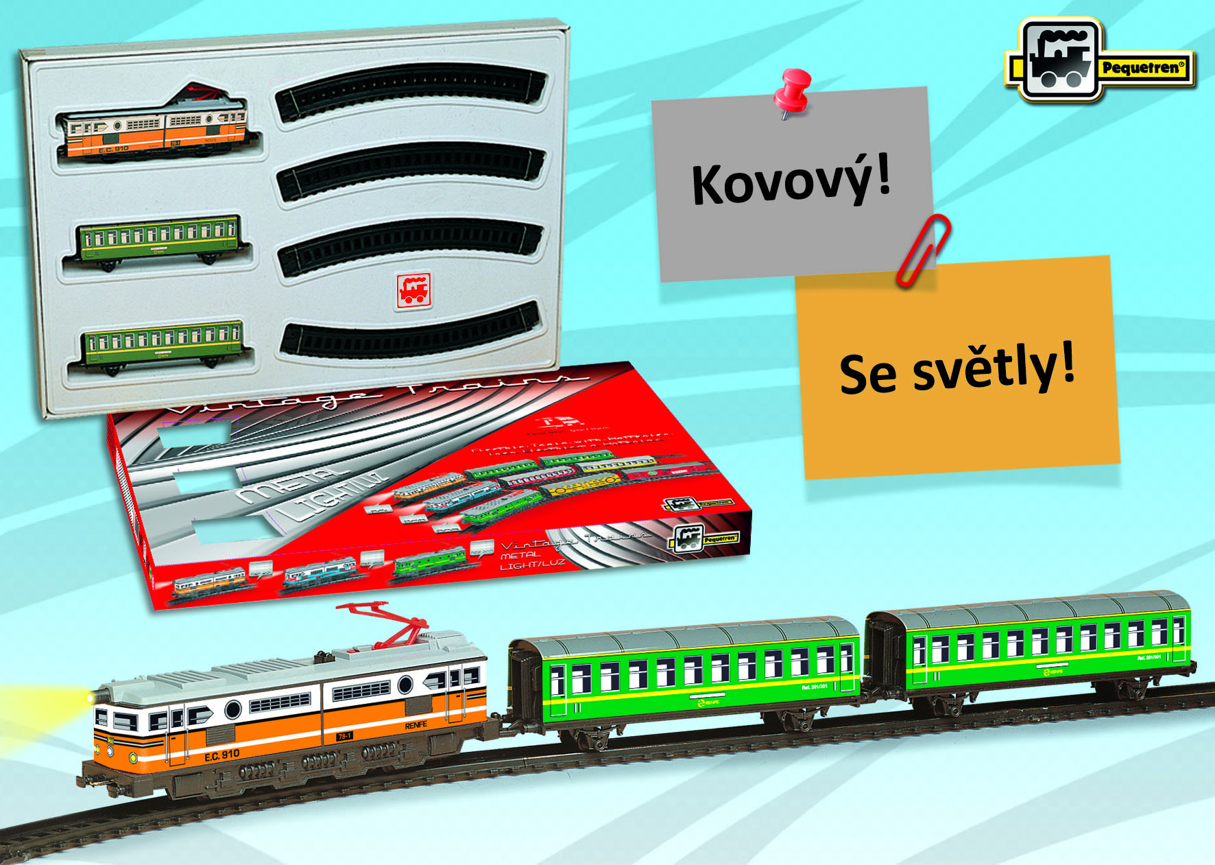 Kovový historický osobní vlak na baterie se světlem a 2 vagóny, který jezdí po trati dlouhé 2,94 m.