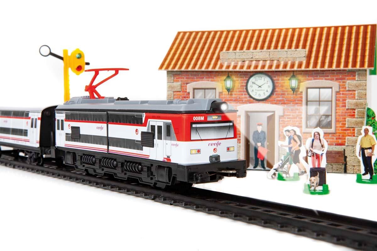 Kovový osobní vlak na baterie se světly, 3 vagóny, železniční stanicí a čepicí přednosty stanice. Vlak jezdí po trati dlouhé 4,4 m. Cercanías je španělský osobní vlak provozovaný španělskými dráhami Renfe.