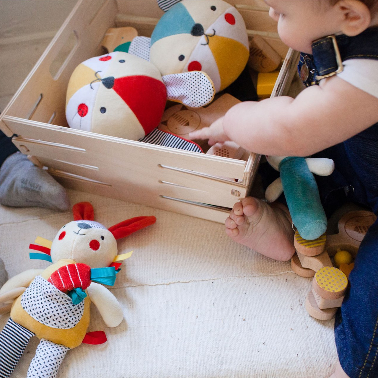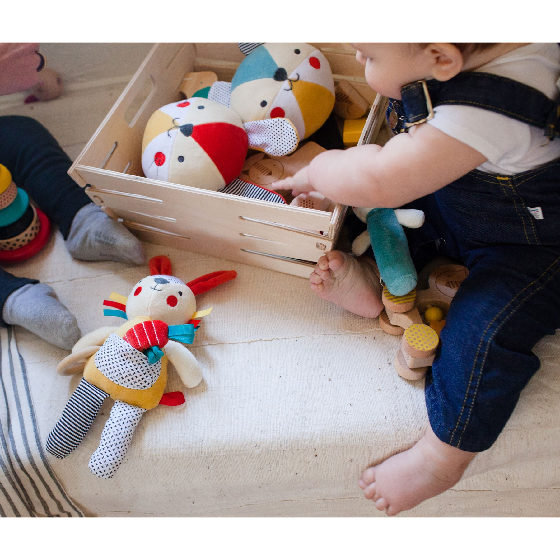 Zábava s chrastícím zajíčkem. Ručně vyrobeny, měkký chrastící zajíček je ideální pro uchopení do drobných rukou. Chrastítko je vyrobeno z organické bavlny nejvyšší kvality s certifikací GOTS. Vhodný od narození.