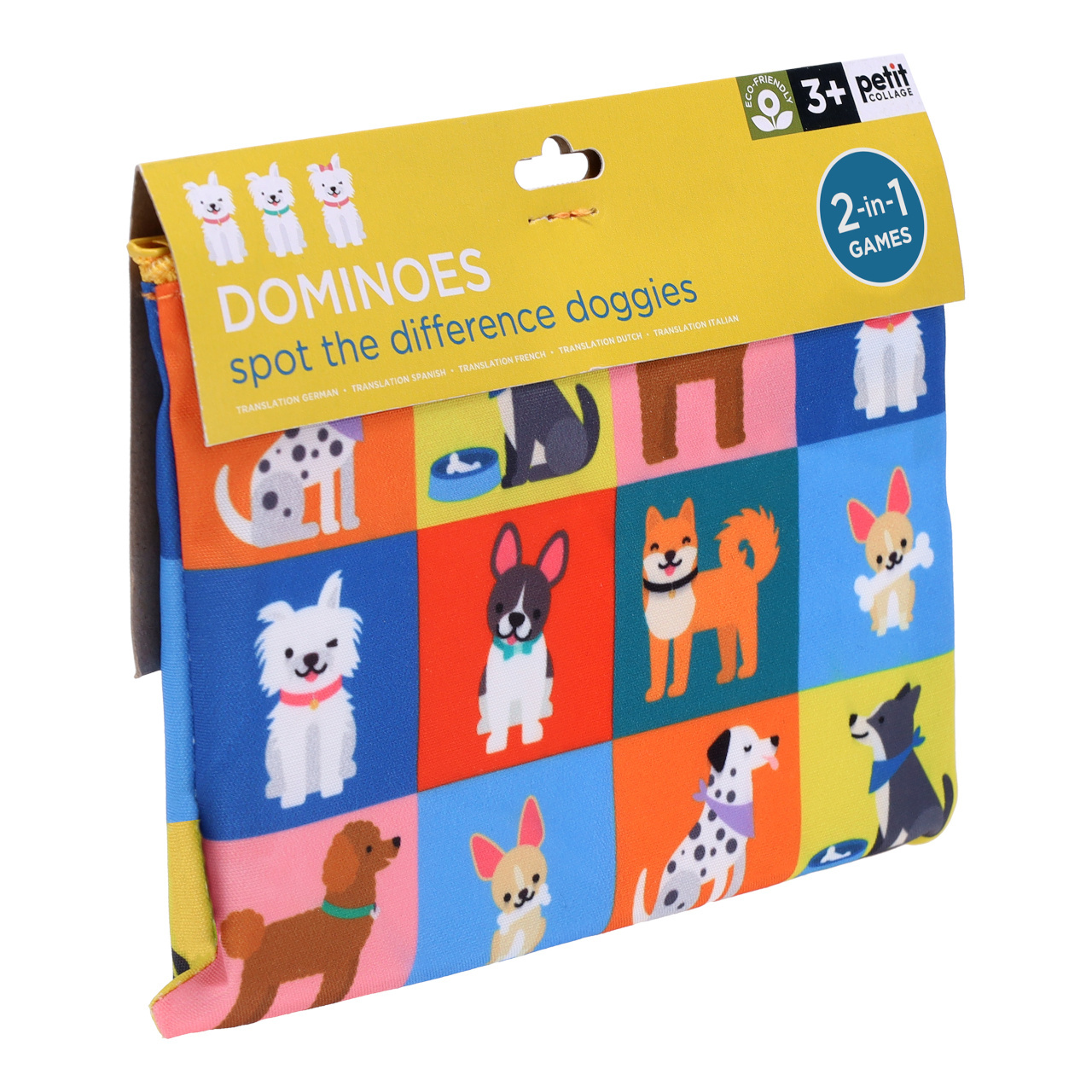 Hra 2v1. Zahrajte si klasické domino s čísly, nebo kartičku otočte a hrajte s obrázky roztomilých pejsků. Domino obsahuje 28 oboustranných kartiček vyrobených z 80% z recyklovaného papíru. Tato hra pro předškolní děti je zábavná i edukativní zároveň. Klasická hra je zabalena v praktickém pytlíku na zip, kartičky tak do něj lze jednoduše uložit a domino se stává vhodným společníkem na doma i na cesty.