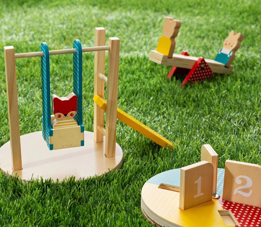 Pojďte si pohrát na hřiště se zvířecími kamarády liškou, medvědem a zajíčkem! Díky zábavným atrakcím včetně kolotoče, houpačky a houpačky se skluzavkou a třem zvířecím postavičkám si děti užijí spoustu zábavy. Pohoupejte se na houpačkách, sjeďte ze skluzavky nebo se točte na kolotoči. Dřevěná sada zlepšuje jemnou motoriku, prohlubuje pochopení příčiny a následku, rozvíjí emoční vnímání a podporuje samostatné hraní. Je vyrobena z FSC® dřeva a FSC® papíru, obal je potištěn s využitím 75 % recyklovaných materiálů a je plně recyklovatelný.