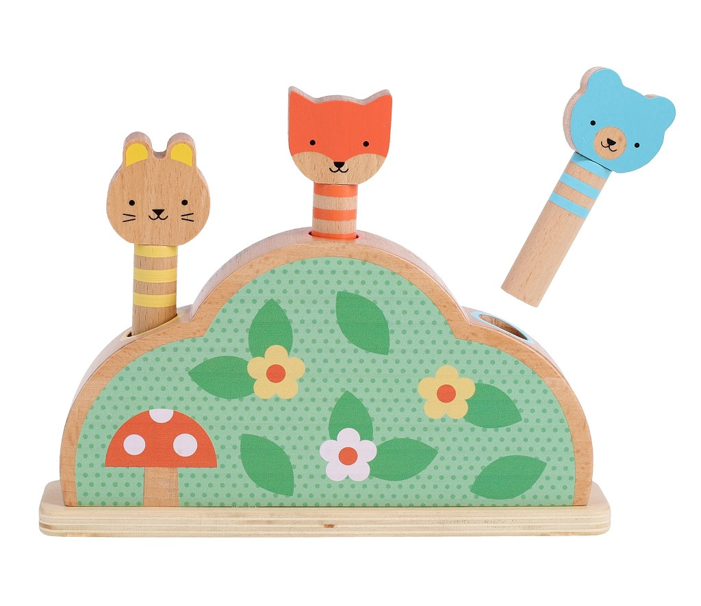 Tlačte, mačkejte a zažijte úžasnou zábavu s touto robustní dřevěnou hračkou. Děti si tuto hru zamilují! Obsahuje tři postavičky kolíčků a základnu odrazového můstku. Zvířátka jsou nabitá pružinou a připravena na vyskočení ze svého pelíšku. Hra rozvíjí jemnou motoriku, koordinaci rukou a očí, rozpoznávání barev a tvarů a rozvíjí porozumění příčinám a následkům.