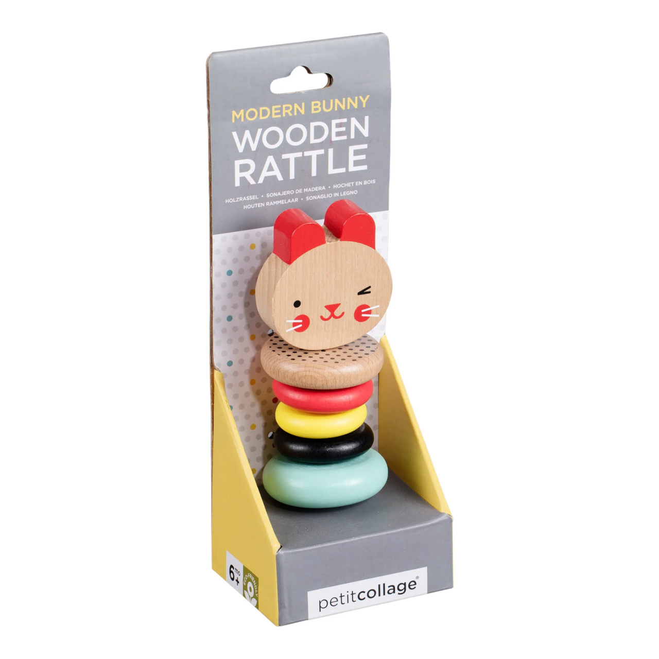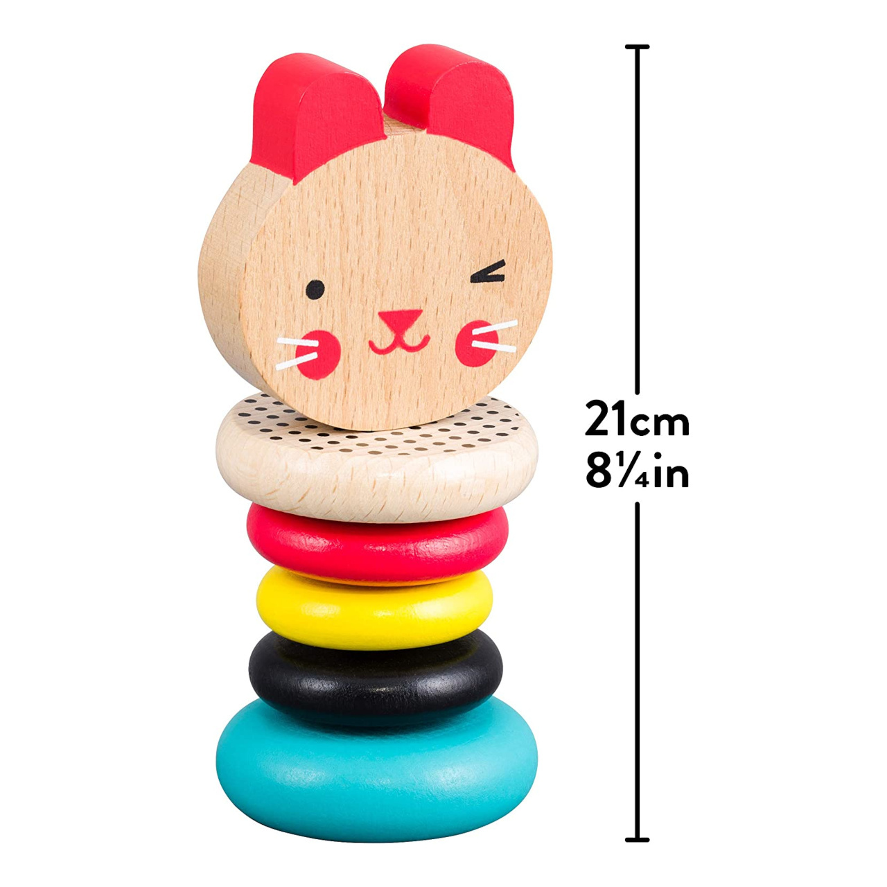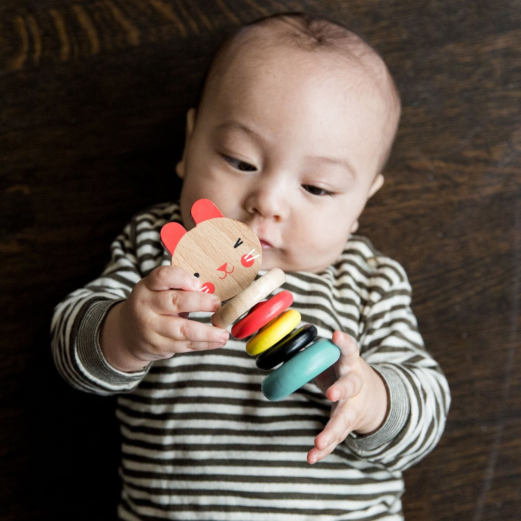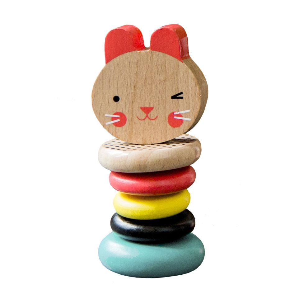 Barevné chrastítko vydává při jemném otřesu uklidňující zvuk klepání. Pět hladkých prstenů z bukového dřeva je ideální pro uchopení dětskými ručičkami. Zářivé barvy a vzory vyvolávají v dětech zvídavost a zajíčka si oblíbí každé malé dítě.