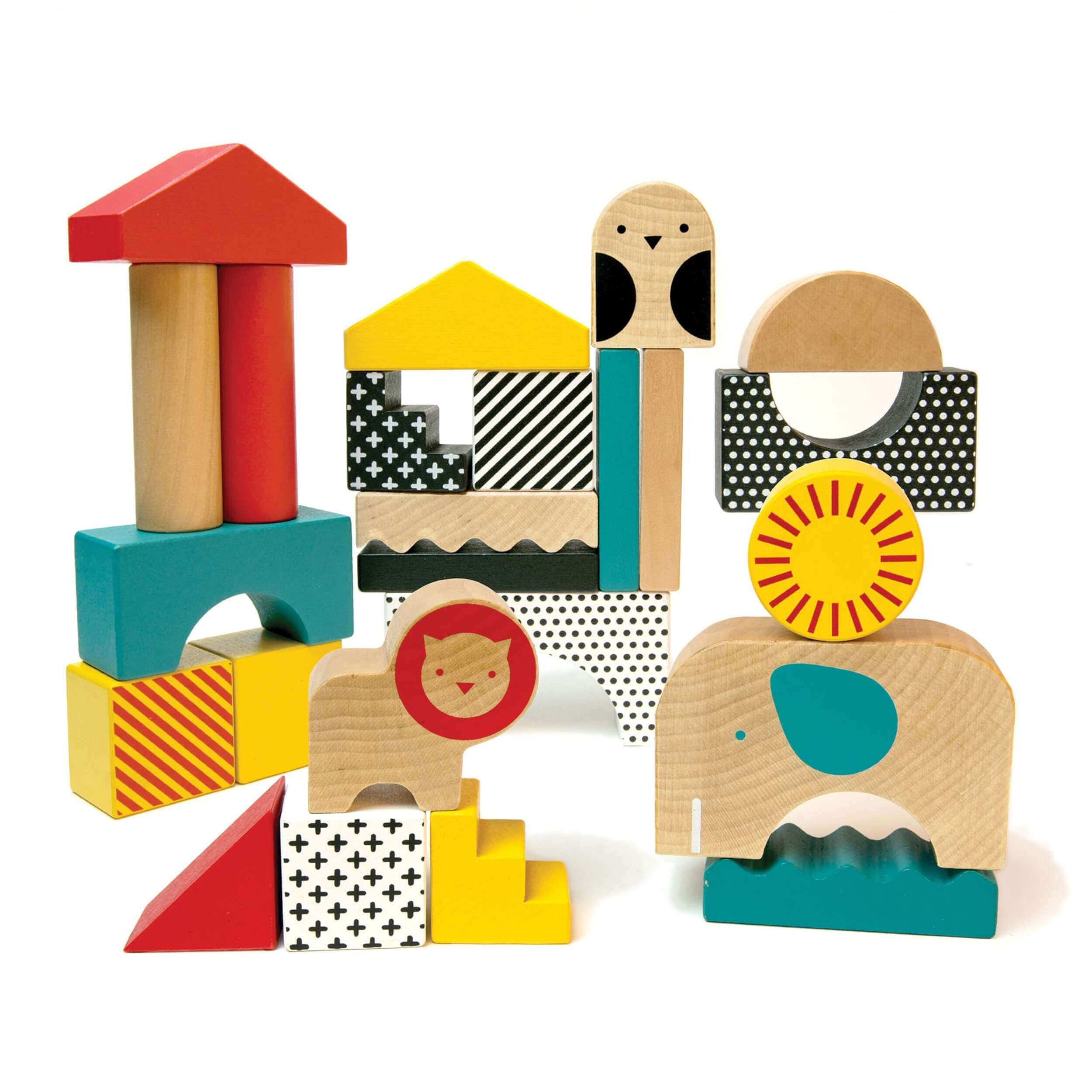 Skládejte, stavte, zbořte, opakujte. Robustní kostky mají jemně zaoblené okraje a jsou jednoduše uchopitelné. Perfektní pro batolata. S 26 dílky v různých tvarech a barvách mohou děti postavit cokoliv, kreativitě se meze nekladou. Obsahuje 14 tvarů a několik vzorů, od teček po proužky a 3 zvířata.