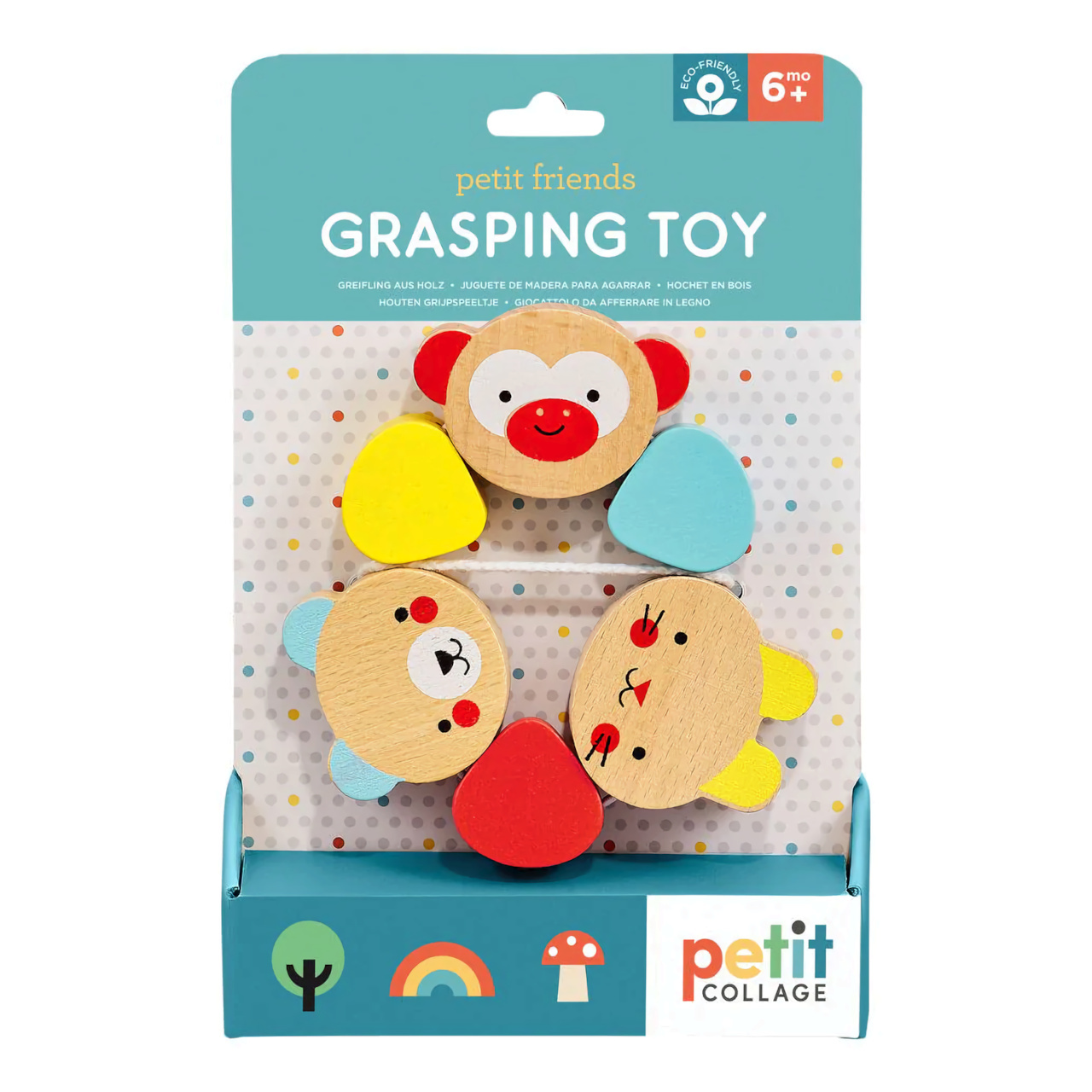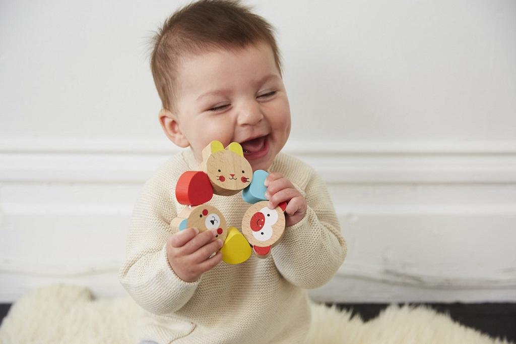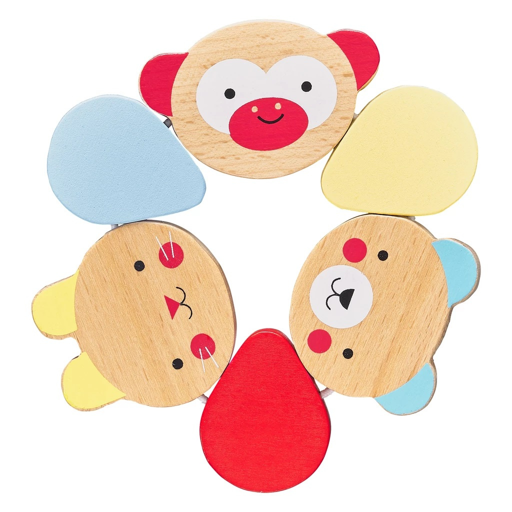 Kousátko, které je ideální pro novorozence, kteří neudrží ruce chvíli v klidu! Obsahuje šest dílků z pevného dřeva, z toho tři vykreslují milé tváře zvířátek, tři mají tvar barevných kapek. Jsou spojeny pevnou plastovou šňůrkou, vydrží i to nejpevnější sevření.