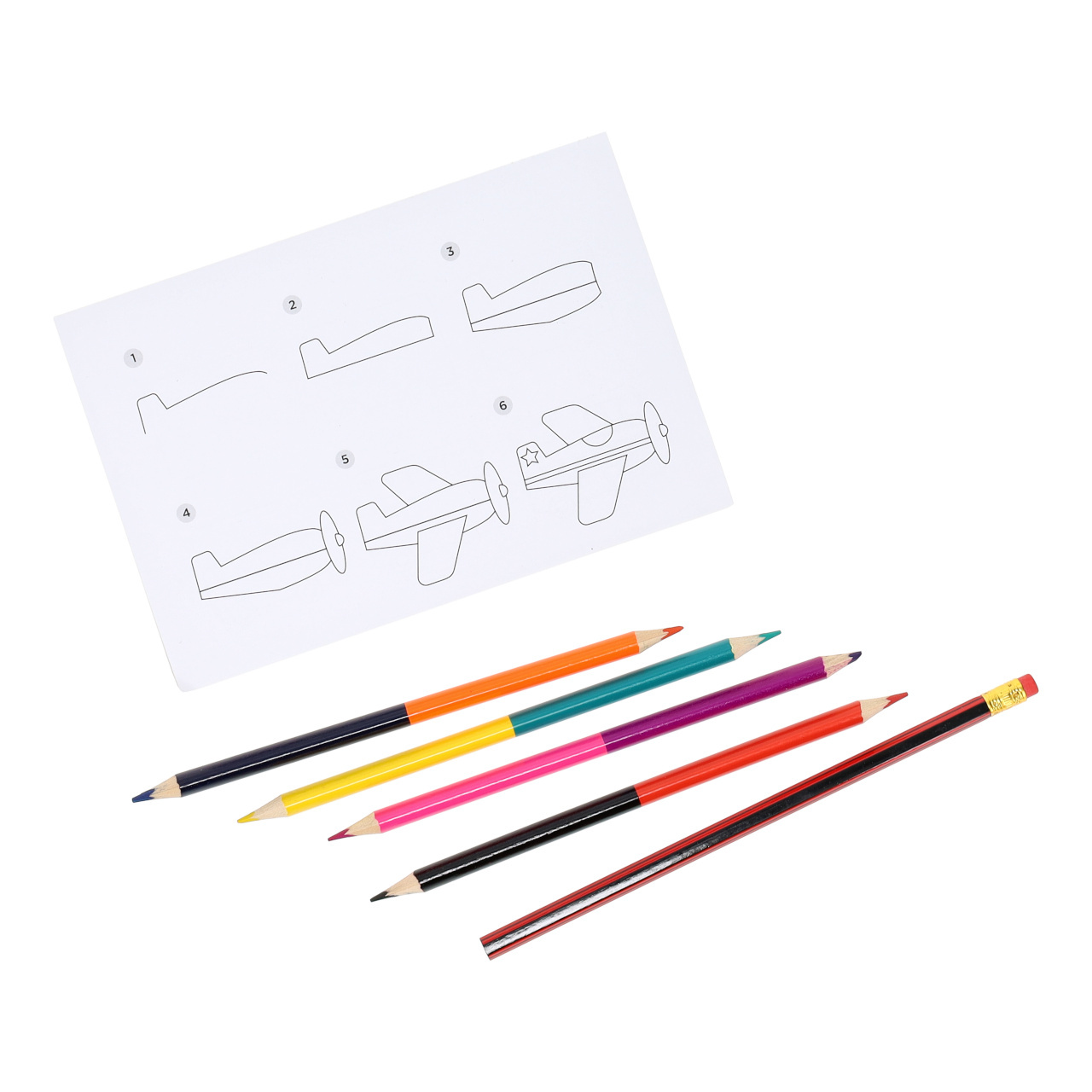 obsahuje návod, kreslící podložku, 4 oboustranné pastelky a tužku s gumou