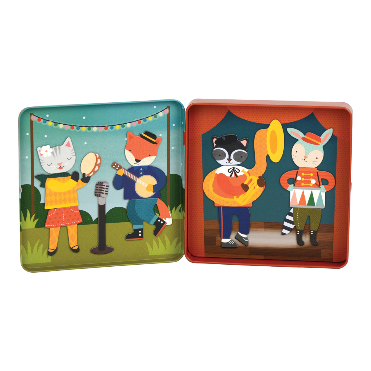 Připněte magenty do knížky, mixujte různé dílky a vytvářejte postavičky zvířecích hudebníků! Balení obsahuje přes 25 magnetických dílků, s kterými si děti dokáží vyhrát. Zabaleno v plechové krabičce, která se dá pevně zavřít, perfektní hračka na cesty. Plechová krabička má uvnitř na stěnách dvě scenérie.