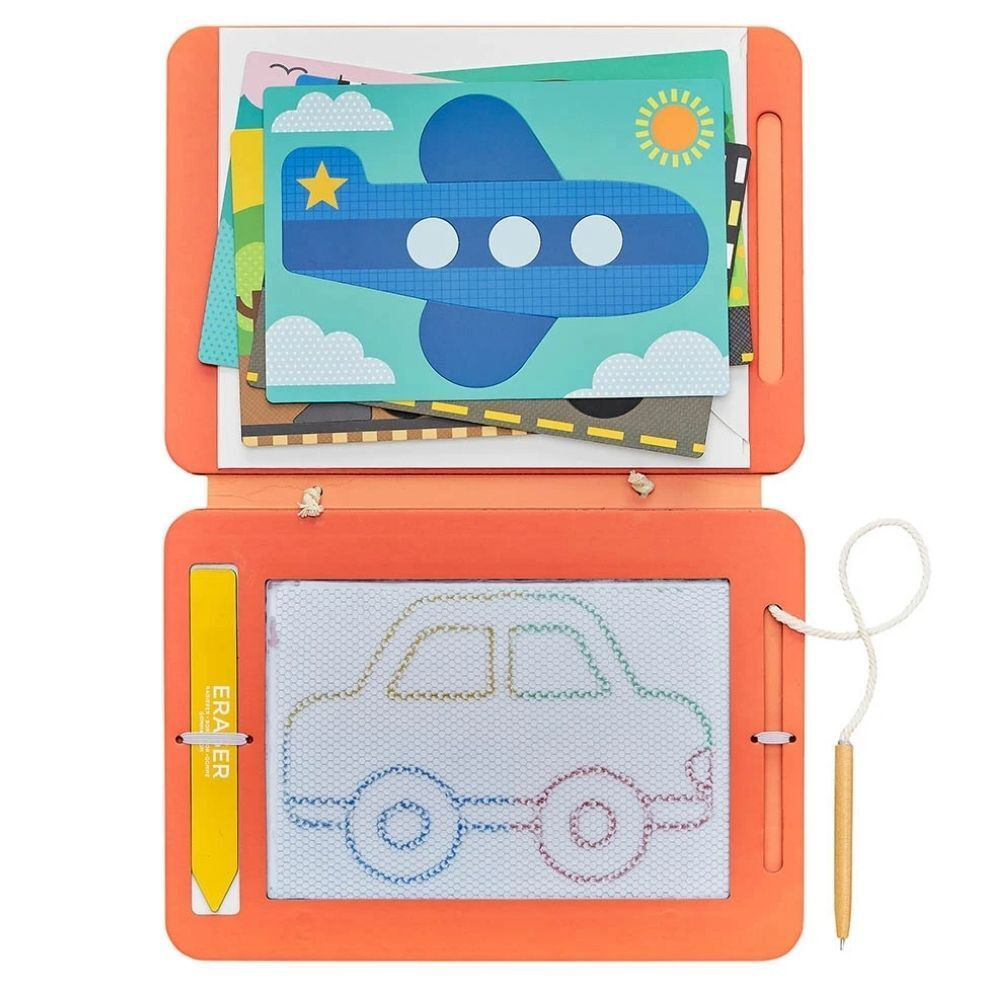 Rozprouděte představivost dětí s touto magnetickou kreslící tabulkou! Perfektní kreativní hračka domů i na cesty, má magickou tužku, která je připevněna k tabulce provázkem. Dále zde najdete mízítko a 5 ks předlohy pro kreslení. Když zrovna nekreslíte, můžete předlohy uložit do kapsy tabulky. Přiložte mizítko z druhé strany tabulky a rychle vymažte své umělecké dílo – můžete začít kreslit něco nového. Vyrobeno za použití recyklovaných materiálů, natištěno barvami na bázi zeleniny. Vhodné od 4 let. Neobsahuje BPA, ftaláty, olovo ani formaldehyd. Tolerance několika nemazatelných bodů.