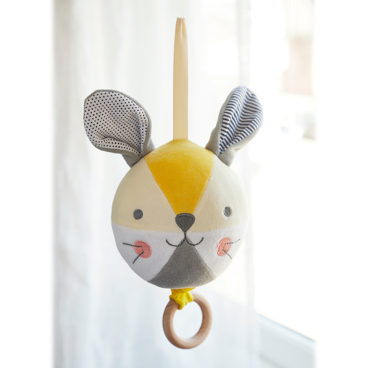 Poddajný a měkoučký míček v podobě králíčka spolehlivě ukolébá Vaše miminko. Po zatáhnutí za dřevěný kroužek přehraje 2 minuty uklidňující melodie písně „You Are My Sunshine“. Vyrobeno z organické bavlny.