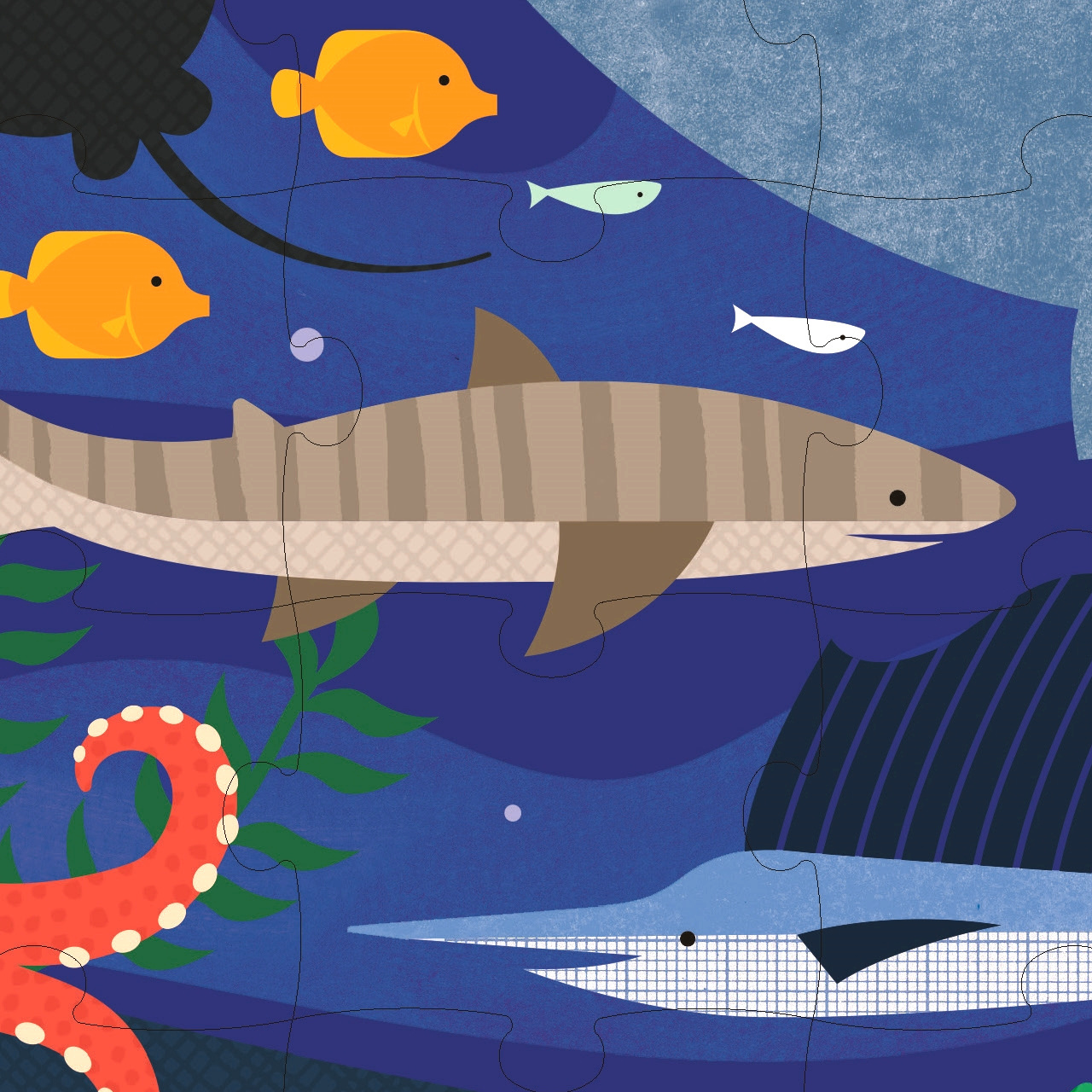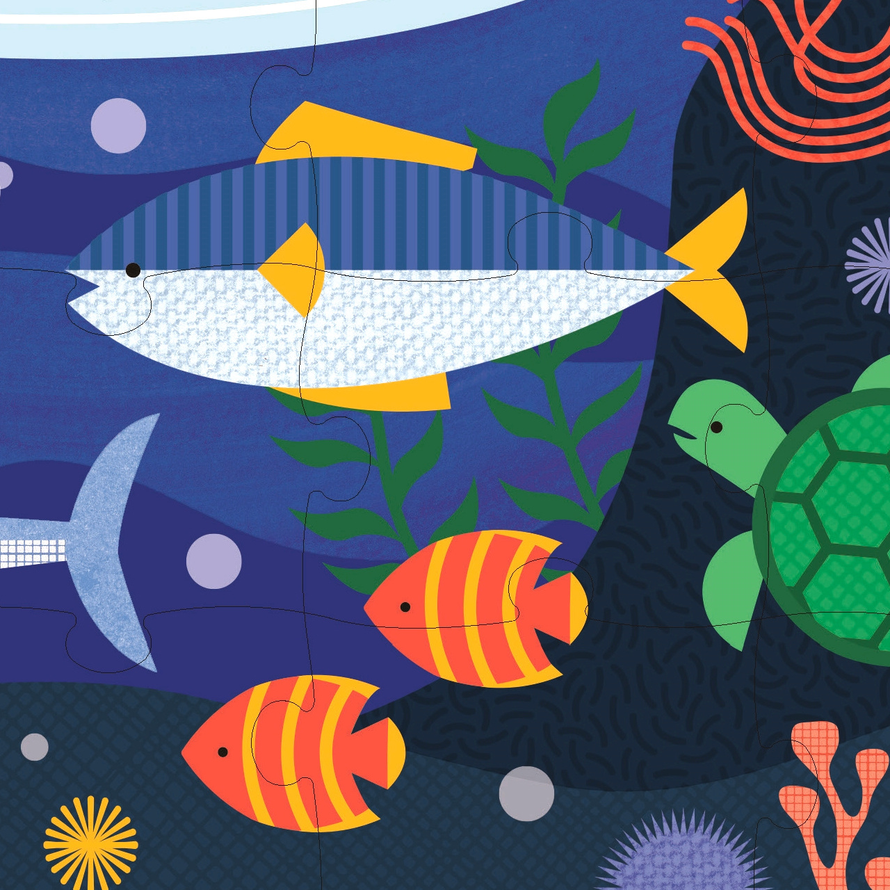 Podmořské puzzle má 49 dílků a je oboustranné. Kolik živočichů dokážete rozpoznat? Oboustranné puzzle má 2 unikátní designy, dvojitá zábava! Puzzle je zabaleno v pytlíku s poutkem z látky ze 100% recyklovaného polyesteru. Je tak vhodné i na cesty. Puzzle z FSC papíru je natištěno barvami vyrobenými ze zeleniny.