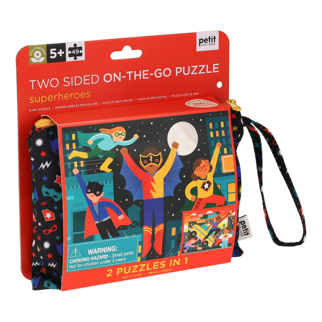 Neobyčejné oboustranné puzzle umožní dětem být při těch nejnapínavějších superhrdinských dobrodružstvích. Atraktivní a pečlivě zpracované motivy mohou pomoci rozvíjet schopnost dětí soustředit se, rozpoznávat tvary i barvy a řešit jednoduché logické problémy. Skládačka je vyrobena ze 100% FSC® papíru potištěného rostlinnými inkousty a balena v praktické odolné taštičce z recyklovaného polyesteru. Zábava tak může děti provázet i při výletech mimo domov a žádný dílek se přitom neztratí!