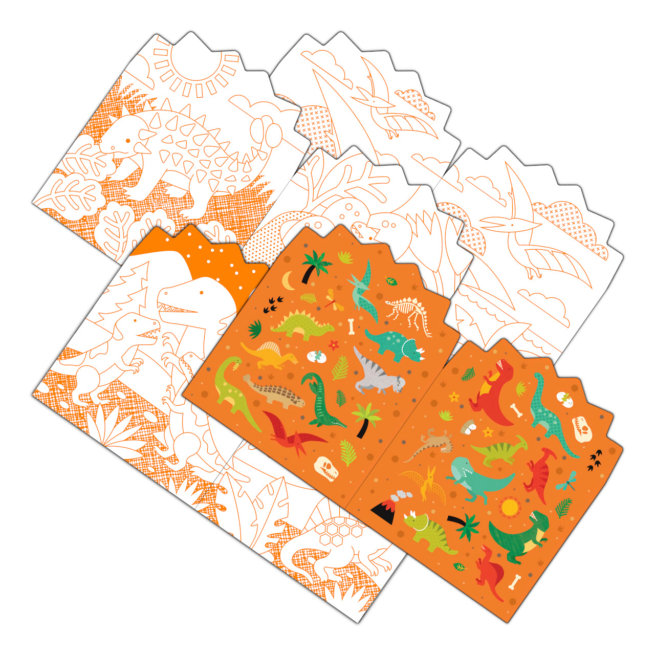 Připravte pastelky! Scény s oblíbenými dětskými postavičkami, či zvířaty lze po vybarvení dozdobit některými z velké sady přibalených pestrobarevných samolepek. Jednoduché roztomilé tvary děti nadchnou a rozjitří jejich fantazii. Vyrobeno z udržitelně získaného papíru.