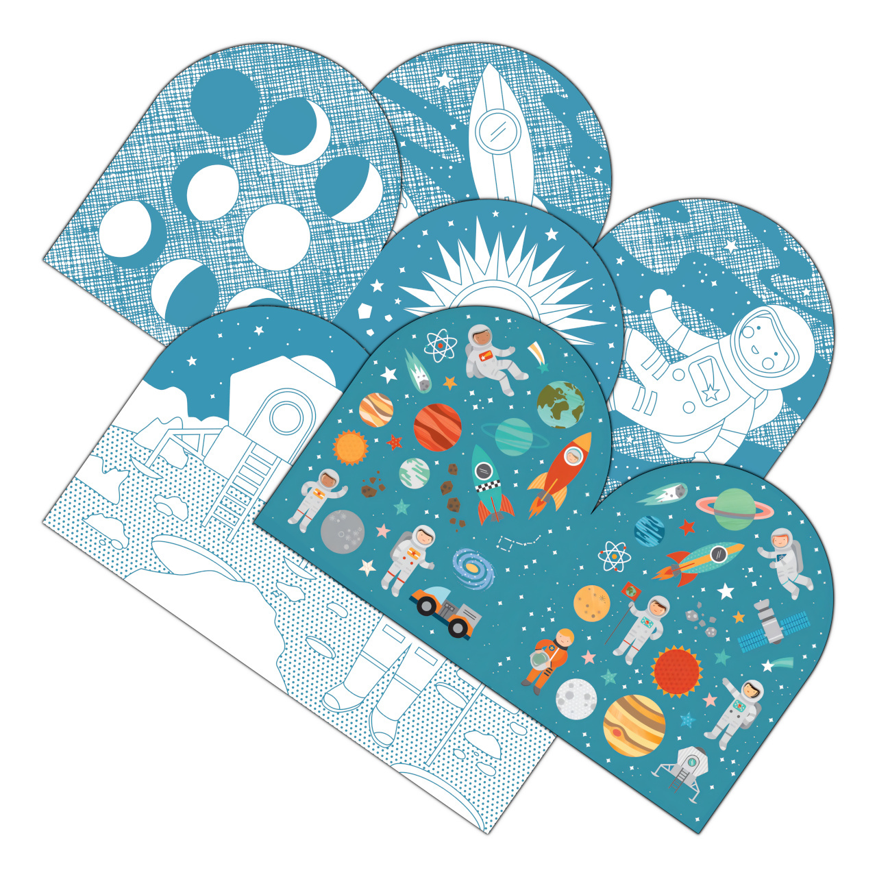 Připravte pastelky! Scény s oblíbenými dětskými postavičkami, či zvířaty lze po vybarvení dozdobit některými z velké sady přibalených pestrobarevných samolepek. Jednoduché roztomilé tvary děti nadchnou a rozjitří jejich fantazii. Vyrobeno z udržitelně získaného papíru.