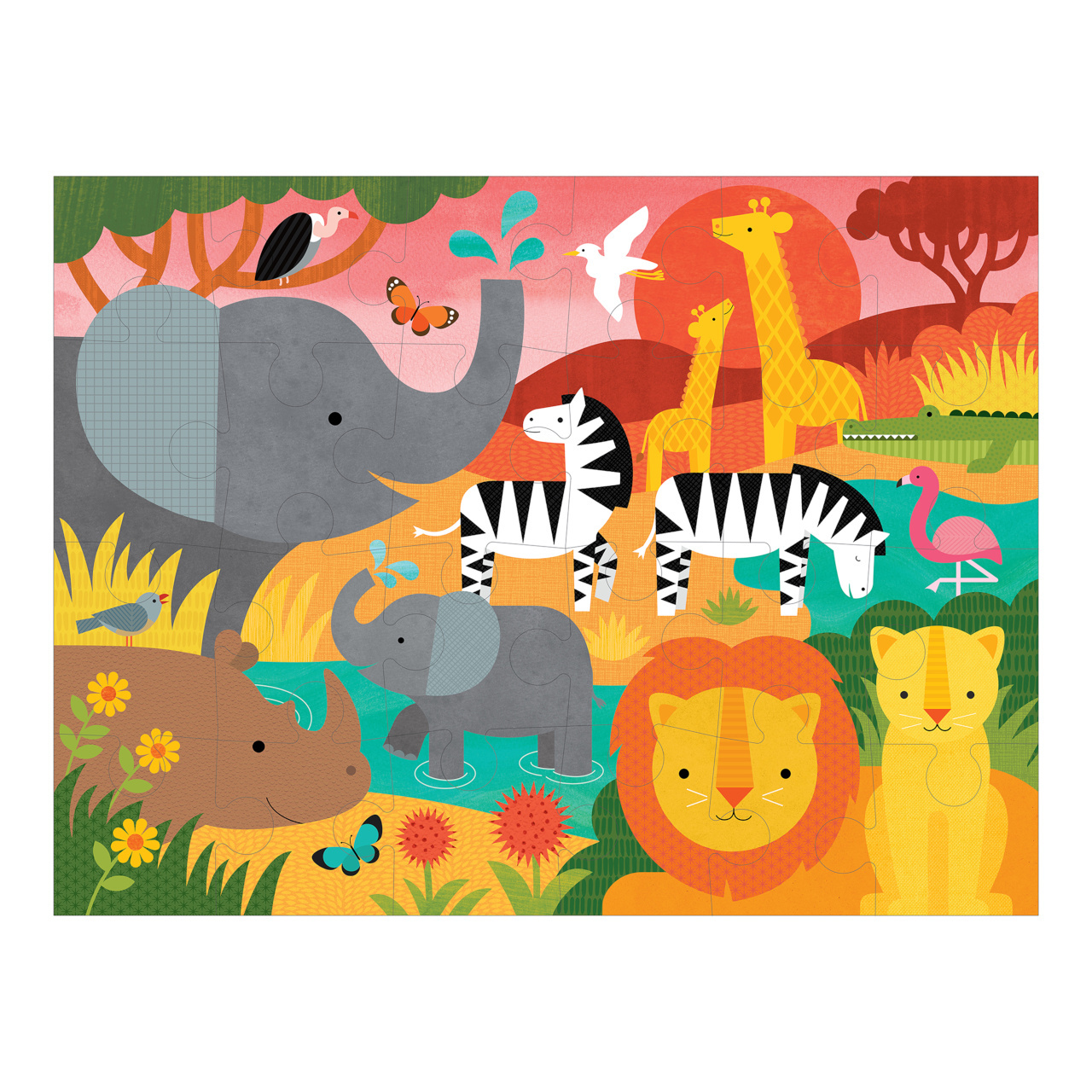 Puzzle pro všechny milovníky safari. Při jeho sestavování se může dítě učit vše o safari světě. Dílky jsou velké a robustní, skládačka je určena ke hře na podlaze. Baleno v praktické krabičce z recyklovaného kartonu, vybavené provázkovým uchem.