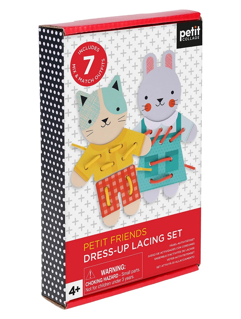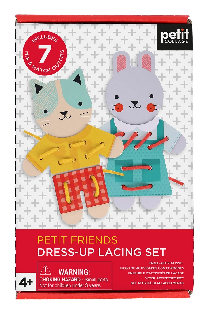 Roztomilá provlékací hra ve které jsou 2 zvířecí kamarádi oblékani do odlišných kusů oblečení. Hodiny zábavy při kombinování dětem nabízí posun v jejich představivosti. Práce s nití naopak umožňuje i těm nejmladším získat počáteční zkušenosti s různými vzory stehů. Sada se skládá z kocoura, králíčka, 2 nití a 7 outfitů. Rozvíjí dále obratnost, koordinaci ruka/oko a pomáhá se připravit na zavazování tkaniček.