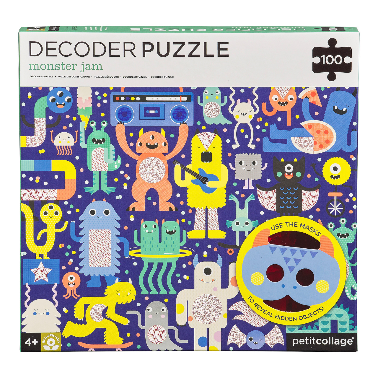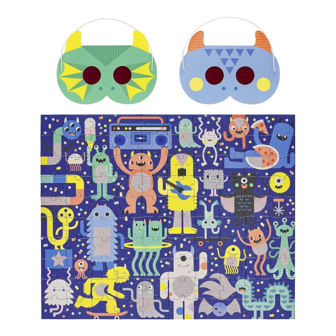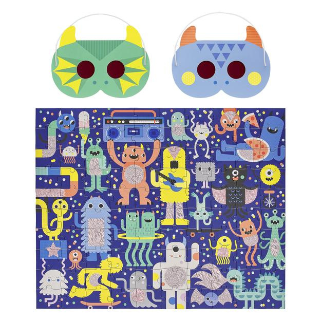 Složte puzzle, a poté pomocí dvou zvířecích 3D brýlí najděte objekty, které se skrývají v rušné scéně. Tyto roztomilé příšerky jsou připraveny slavit na festivalu, ale ztratily pár věcí. Poskládejte puzzle, nasaďte si 3D brýle a pomozte jim najít skryté objekty - 5 sladkostí, 4 objekty s kolečky, 3 pokrývky hlavy, 2 objekty spjaté s hudbou, 1 páchnoucí věc.
