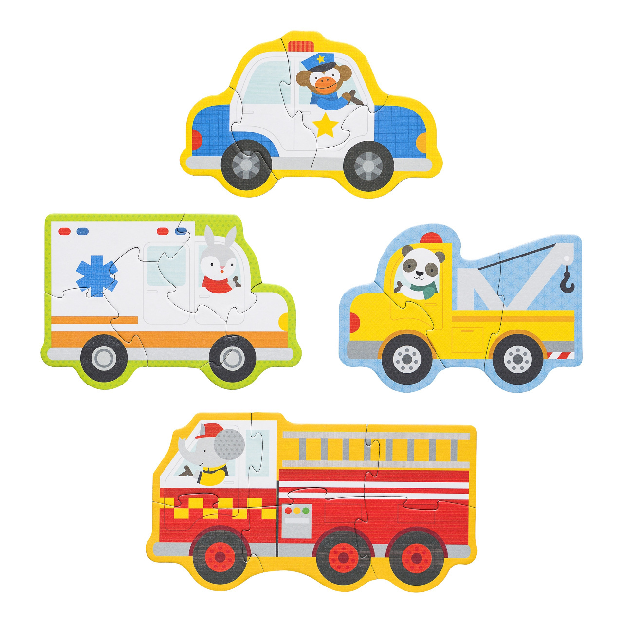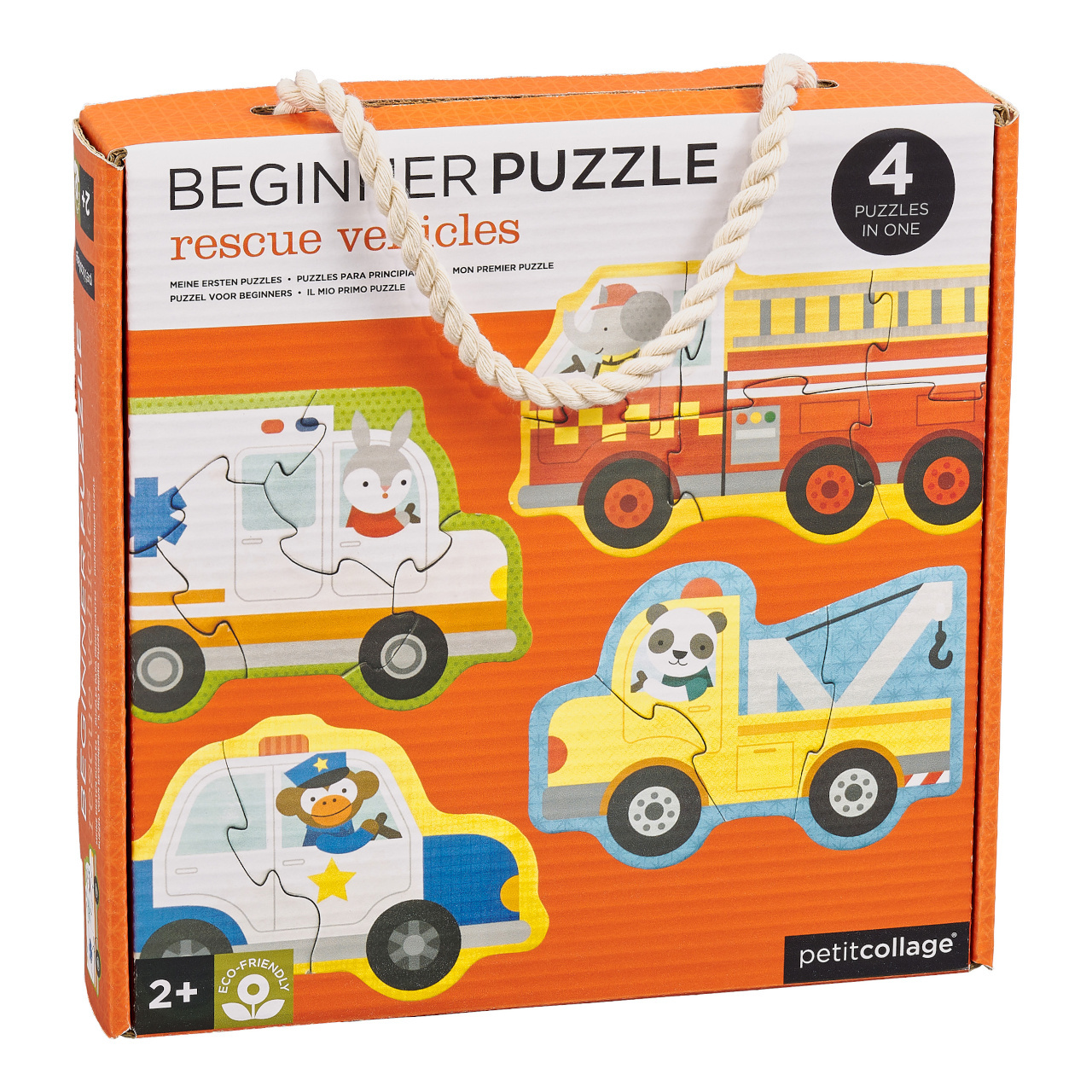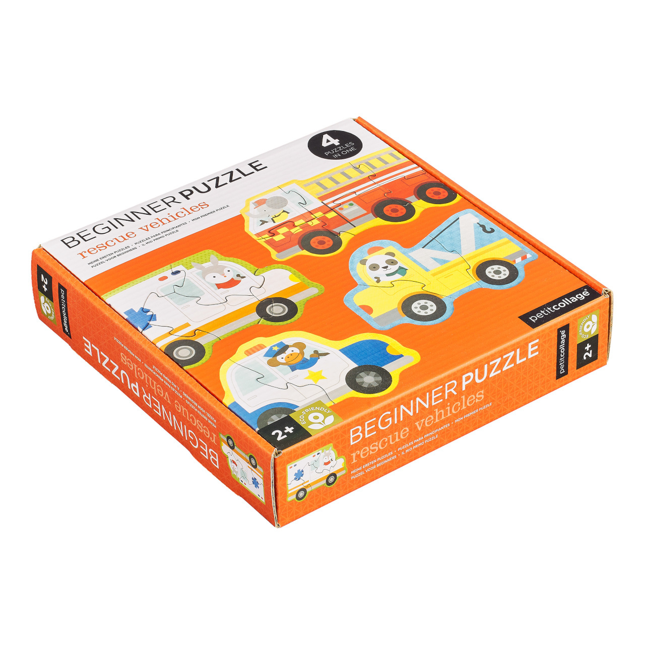Puzzle, kde králík řídí sanitku, opice policejní auto, slon hasičský vůz a panda odtahovku? To jsou skládačky o 3, 4, 5 a 6 kusech. Sada puzzle obsahuje 4 motivy záchranných vozidel. Vyrobeno z recyklované lepenky a potištěné rostlinnými barvami.