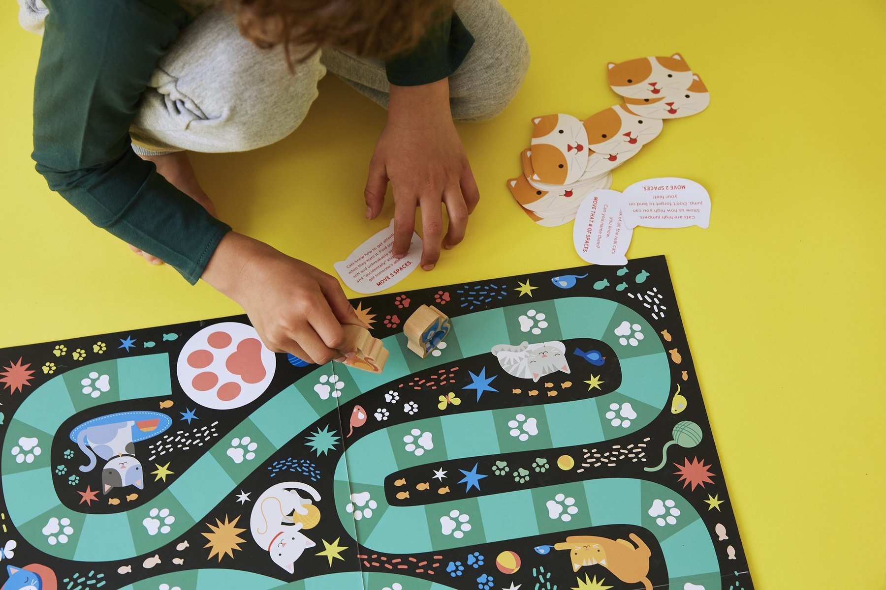 Začíná hráč, který jako poslední v nedávné době pohladil kočku. První hráč hodí kostkou a posune se o počet polí, dle hodnoty hozené na kostce. Pokud stoupne na políčko s kočičí packou, vezme si kartu a splní daný úkol. Splňte úkol a posuňte se o počet polí, který je uveden na kartě. Pokud hráč nemůže splnit úkol z karty, položí ji na odkládací balíček, textem nahoru. Na řadě je další hráč. Hra pokračuje, hráči se na tazích střídají dle určeného pořadí. Házejte kostkou, posouvejte figurky, berte si kartičky dle pacek a plňte úkoly. Pokud jste použili všechny kartičky, jednoduše zamíchejte odkládací balíček a hra může pokračovat.