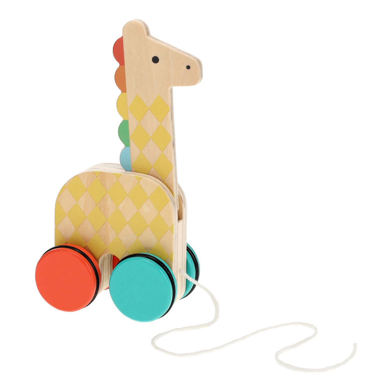 Tuto tahací žirafu na kolečkách si užijí hlavně děti, které se učí chodit. Stačí uchopit bavlněný provázek a žirafa bude při jízdě vtipně pohybovat hlavou. Veselé barvy a zářivý vzor, bude se hodit do každého pokojíčku a pomůže dětem s rozvojem hrubé motoriky. Klasická tahací hračka v moderním designu je vyrobena z FSC dřeva, vhodná od 18 měsíců.
