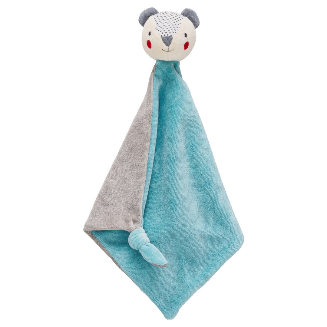 Extra měkká, plyšová dečka s hlavou usměvavého medvídka. Perfektní na poobědový odpočinek. Kontrastní vzory a barvy medvídka podněcují u dětí rozvoj senzoriky, uzlíček na rohu dečky zase mohou držet nebo kousat.