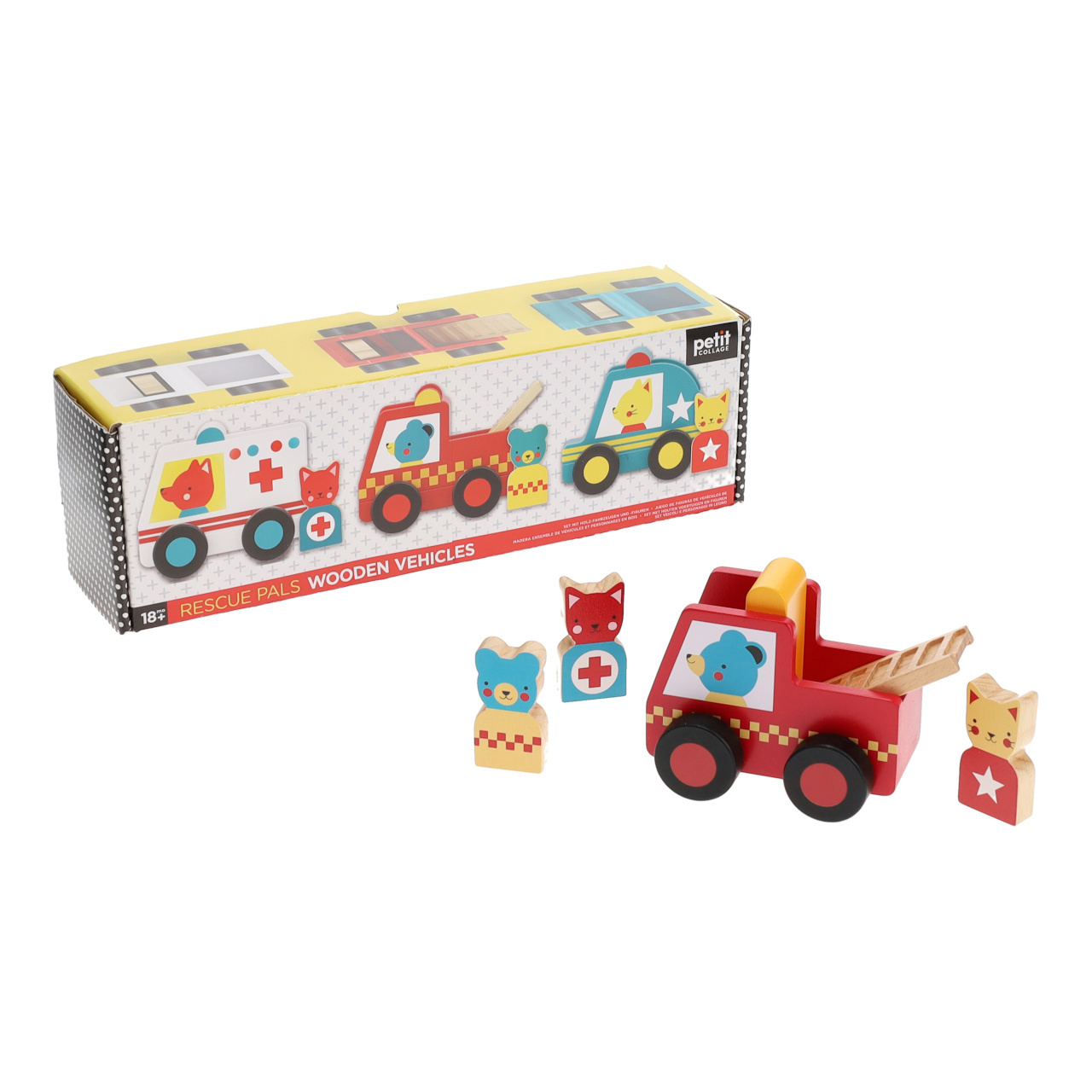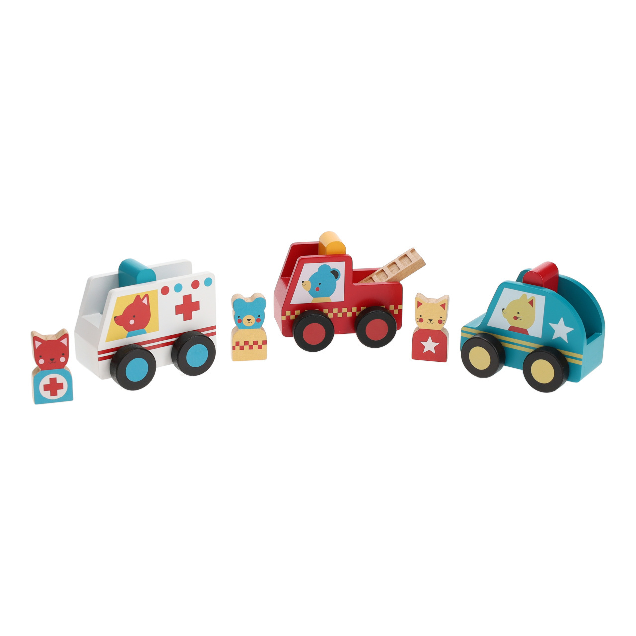 Pro všechny, kdo jsou připraveni vyrazit na pomoc. Souprava záchranářských autíček obsahuje hasičské auto, sanitku a policii. Každé autíčko je doprovázeno figurkou zvířecího řidiče, medvídkem, lištičkou a kotětem. Autíčka jsou robustní a odolná, vše vyrobeno z udržitelně získaných materiálů.