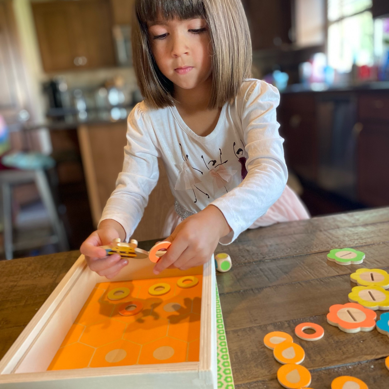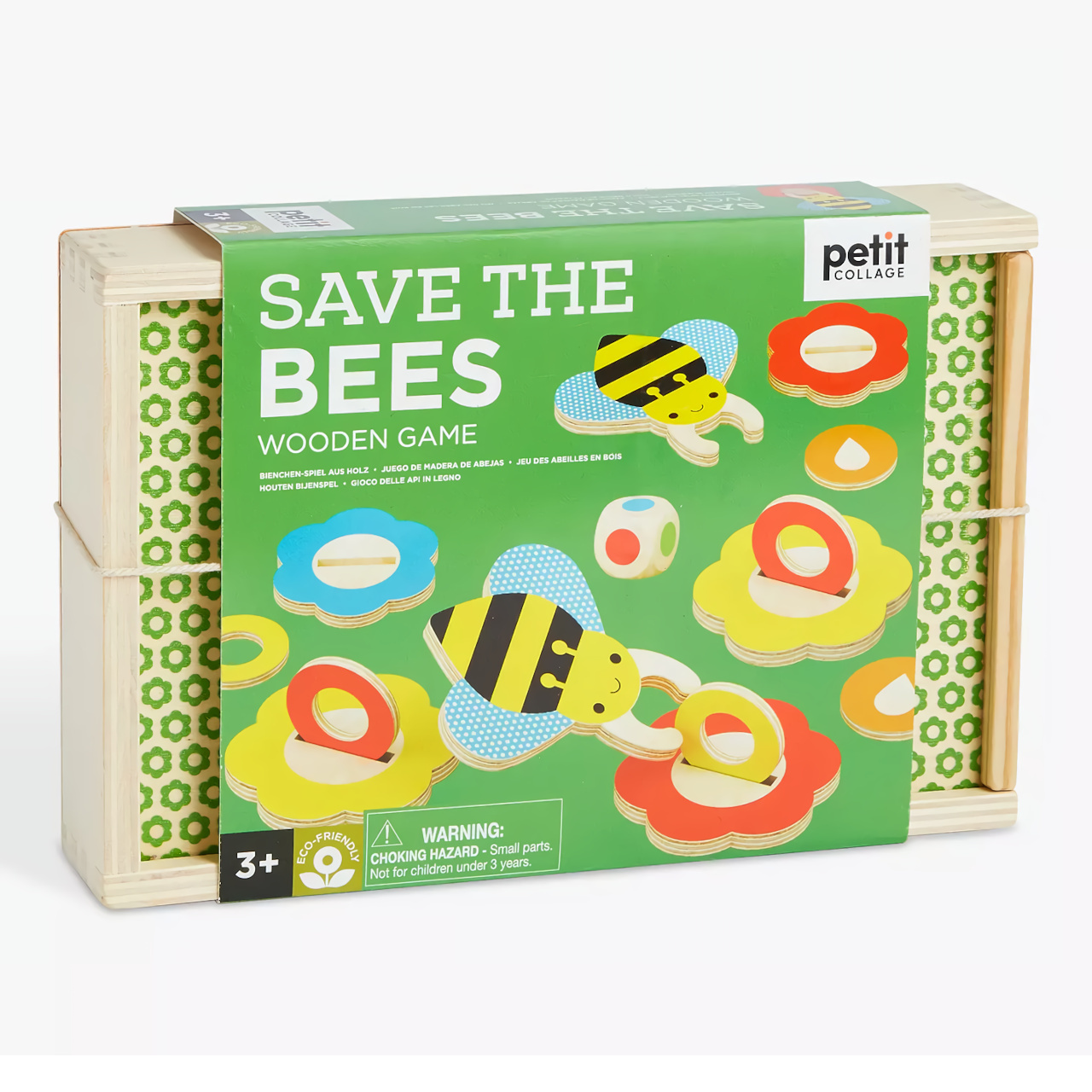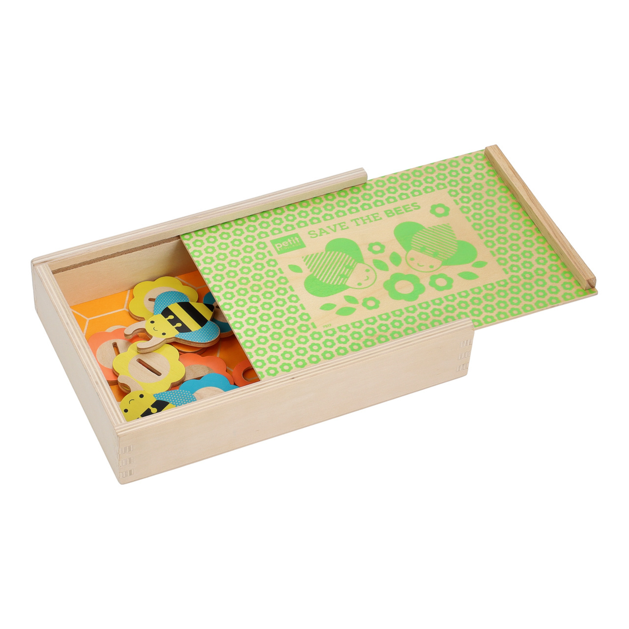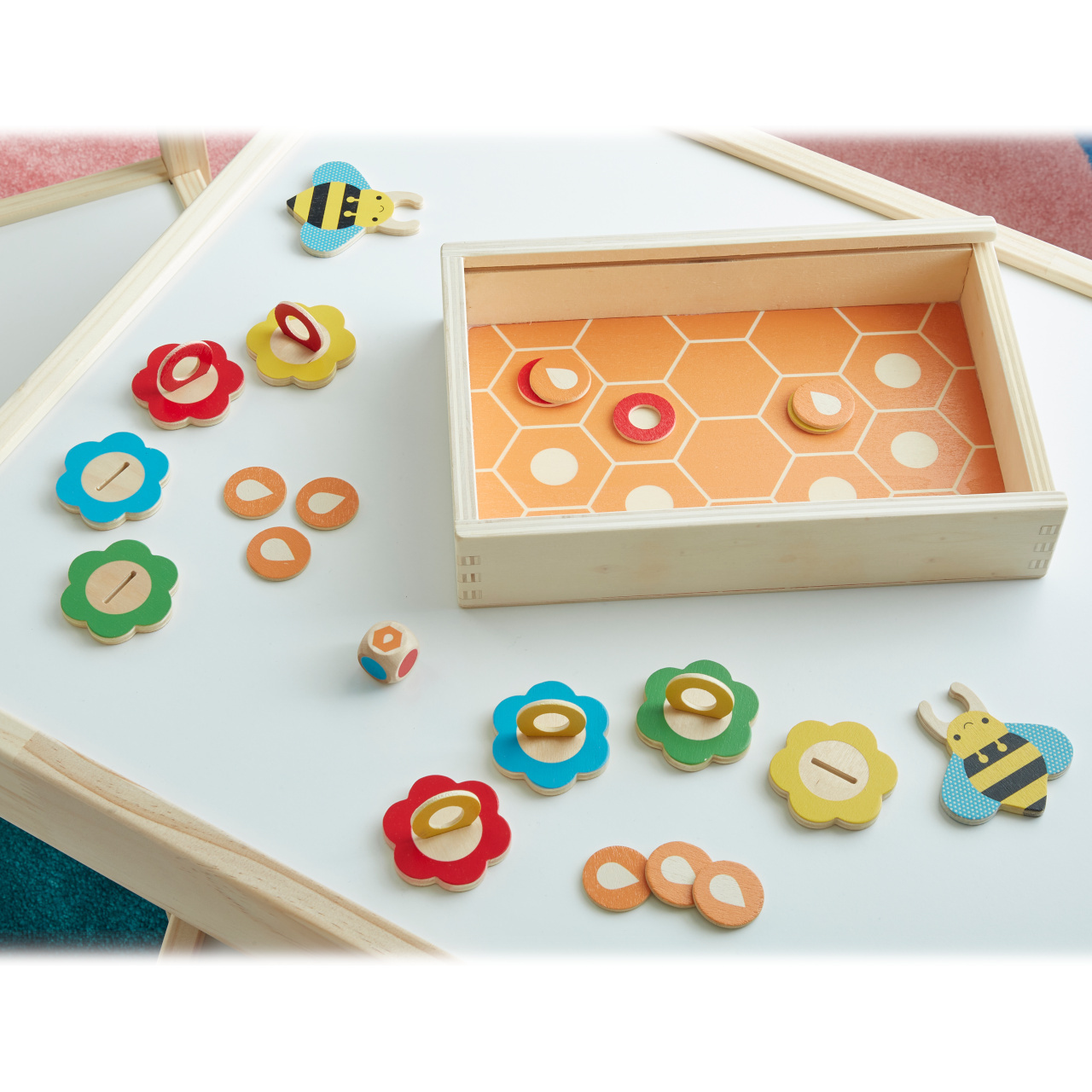 Pomozte včelkám sbírat z květů nektar a vyrábět med. Házejte kostkou, hledejte shodu barev a poznejte význam včel v přírodě. Hra je vyrobena z odolné překližky, součásti jsou vyvedeny v pestrých barvách a uloženy jsou v praktické krabičce.