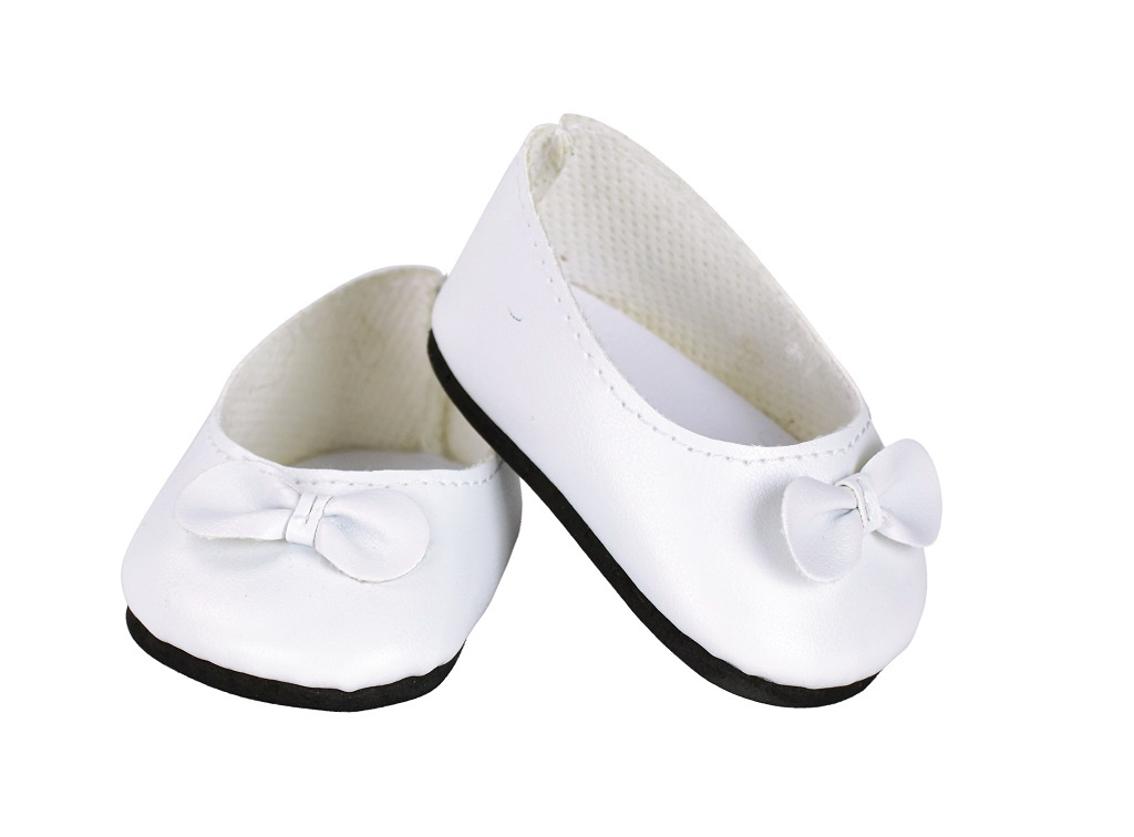 Pár bílých balerínek s mašličkou určený zejména pro panenky Petitcollin řad Écolo Doll, Petit Câlin, Bébé d'amour a Câlinette. Dodáváno v uzavíratelném plastovém sáčku.