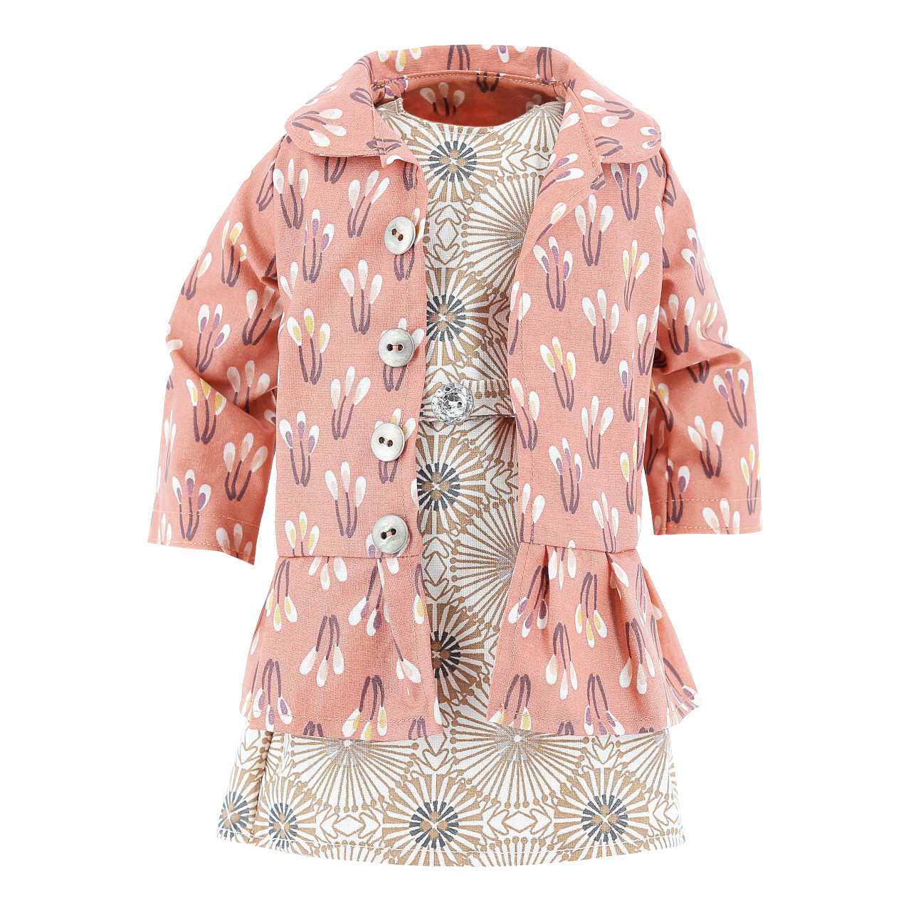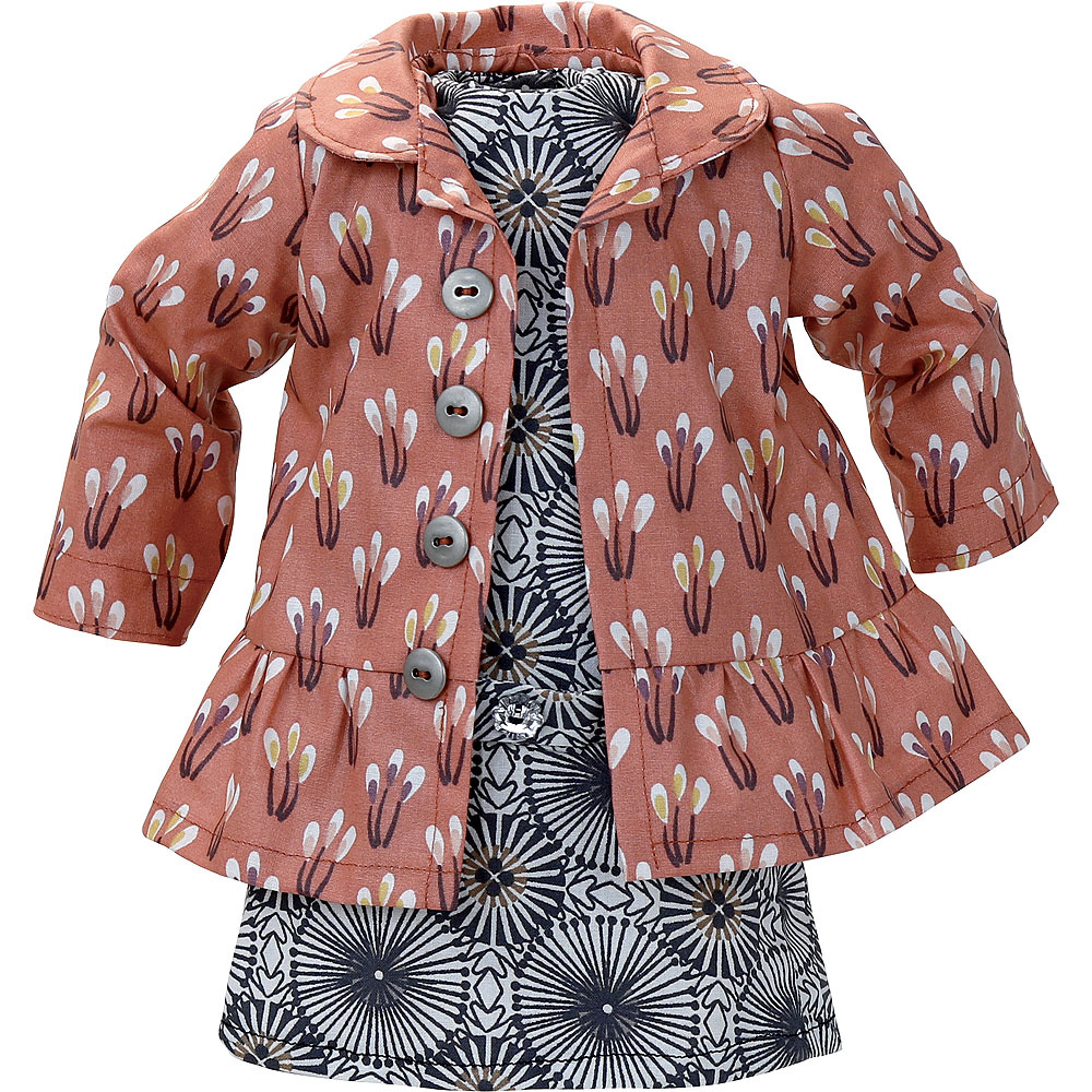 Obleček určený zejména pro panenky Petitcollin řady Finouche. Skládá se z červenohnědého vzorovaného kabátku, vzorovaných šatiček a kloboučku. Oblečky Petitcollin jsou pečlivě zpracované, vynikají francouzskou elegancí, jedinečnou barevností a vzory, díky kterým jsou poutavé a nezaměnitelné. Dodáváno v papírové krabičce s průhledem a plastovým ramínkem.