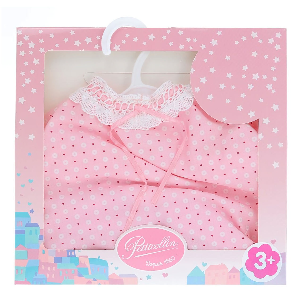 Obleček určený zejména pro panenky Petitcollin řady Petit Câlin odpovídající velikosti. Skládá se ze vzorované růžové blůzky a kraťásků. Oblečky Petitcollin jsou pečlivě zpracované, vynikají francouzskou elegancí, jedinečnou barevností a vzory, díky kterým jsou poutavé a nezaměnitelné. Dodáváno v papírové krabičce s průhledem a plastovým ramínkem.