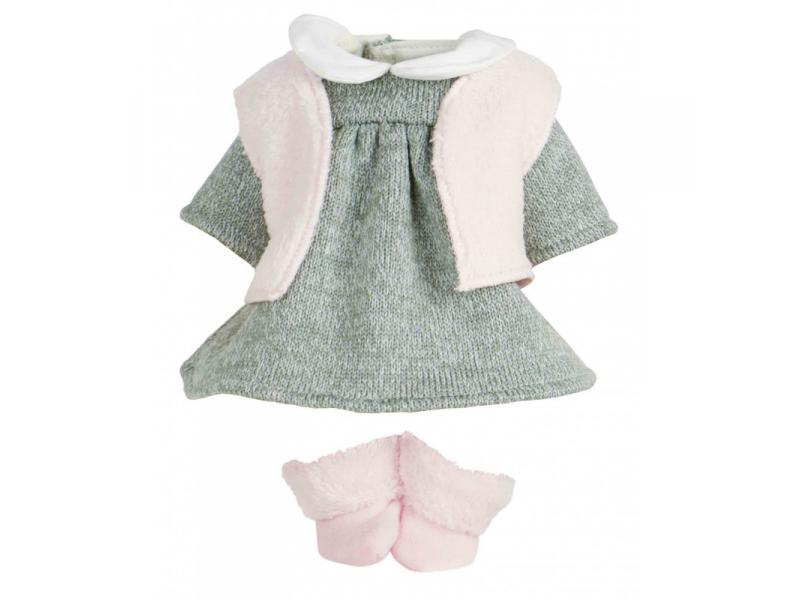 Obleček určený zejména pro panenky Petitcollin řad Écolo Doll, Bébé d'amour, Câlinette a Petit Câlin odpovídající velikosti. Skládá se z šedobílých zimních šatiček, růžové vestičky a páru teplých růžových ponožek. Oblečky Petitcollin jsou pečlivě zpracované, vynikají francouzskou elegancí, jedinečnou barevností a vzory, díky kterým jsou poutavé a nezaměnitelné. Dodáváno v papírové krabičce s průhledem a plastovým ramínkem.