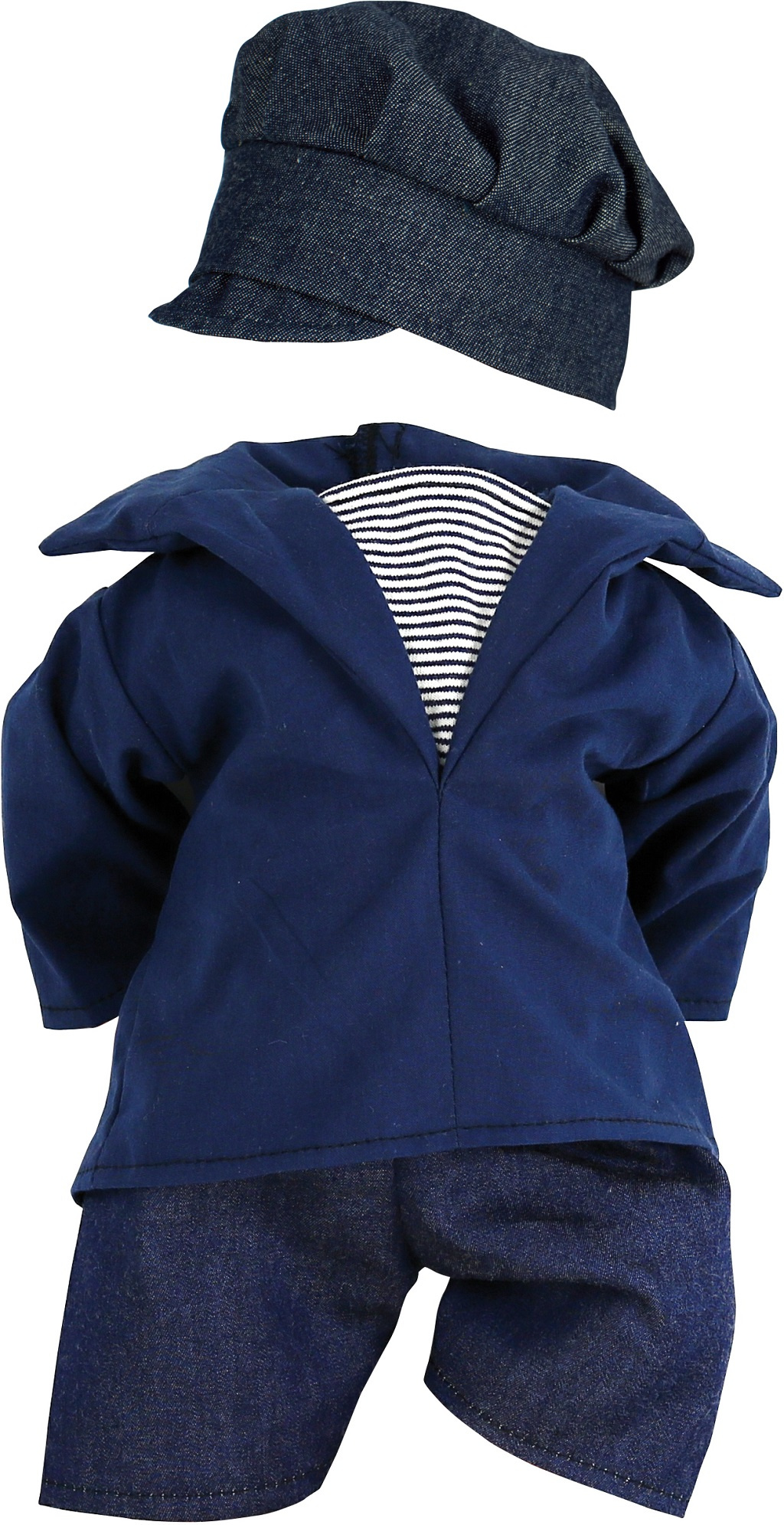 Obleček určený zejména pro koupací panenky Petitcollin s odpovídající výškou. Skládá se z modré blůzy, krátkých modrých kalhot a tmavomodré čepice. Oblečky Petitcollin jsou pečlivě zpracované, vynikají francouzskou elegancí, jedinečnou barevností a vzory, díky kterým jsou poutavé a nezaměnitelné. Dodáváno v papírové krabičce s průhledem a plastovým ramínkem.
