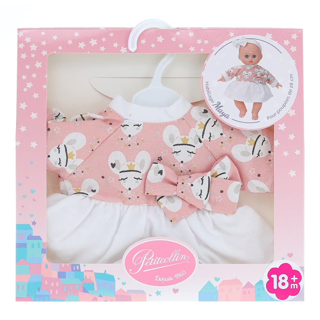 Obleček určený zejména pro panenky Petitcollin řad Écolo Doll, Bébé d'amour, Câlinette a Petit Câlin odpovídající velikosti. Skládá se z jednodílných růžovo‑bílých šatiček a bílé čelenky s mašlí. Oblečky Petitcollin jsou pečlivě zpracované, vynikají francouzskou elegancí, jedinečnou barevností a vzory, díky kterým jsou poutavé a nezaměnitelné. Dodáváno v papírové krabičce s průhledem a plastovým ramínkem.