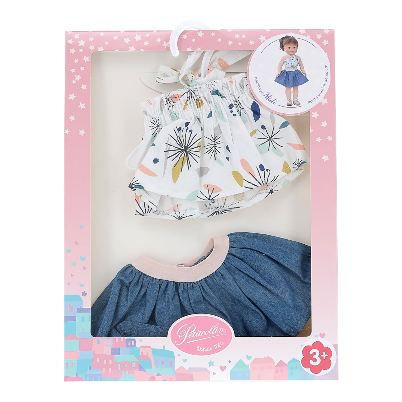 Obleček určený zejména pro panenky Petitcollin řad Émilie, Francette a Marie‑Françoise. Skládá se ze vzorované blůzky, modré sukýnky a stuhy do vlasů. Oblečky Petitcollin jsou pečlivě zpracované, vynikají francouzskou elegancí, jedinečnou barevností a vzory, díky kterým jsou poutavé a nezaměnitelné. Dodáváno v papírové krabičce s průhledem a plastovým ramínkem.
