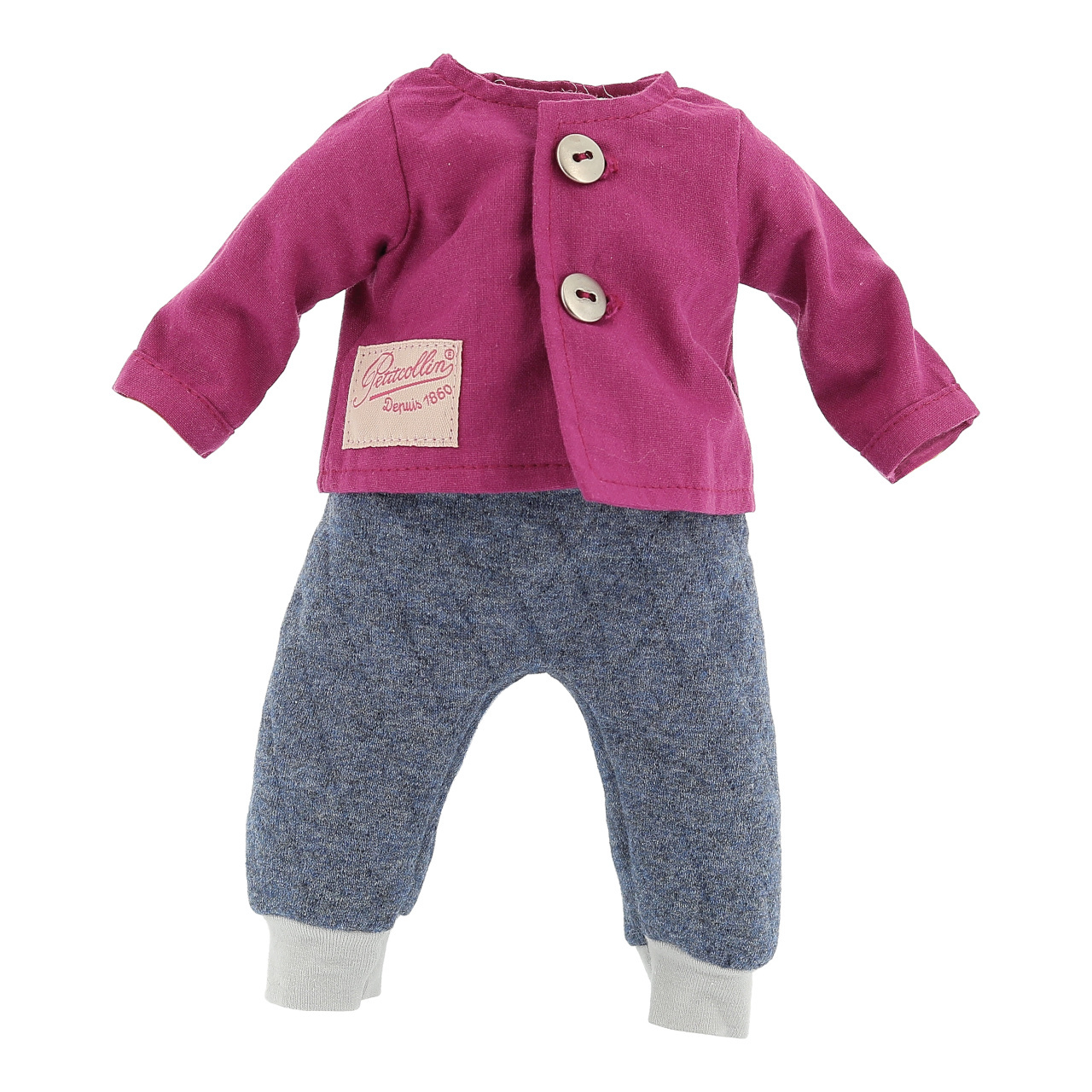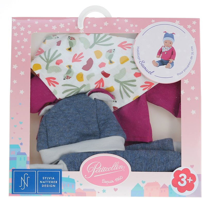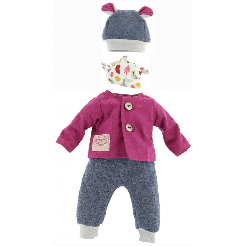Obleček určený zejména pro panenky Petitcollin řady Bibichou. Skládá se z fialové košile, šedých tepláčků, bílého šátku s potiskem a šedé čepičky zdobené ušima. Oblečky Petitcollin jsou pečlivě zpracované, vynikají francouzskou elegancí, jedinečnou barevností a vzory, díky kterým jsou poutavé a nezaměnitelné. Dodáváno v papírové krabičce s průhledem a plastovým ramínkem.