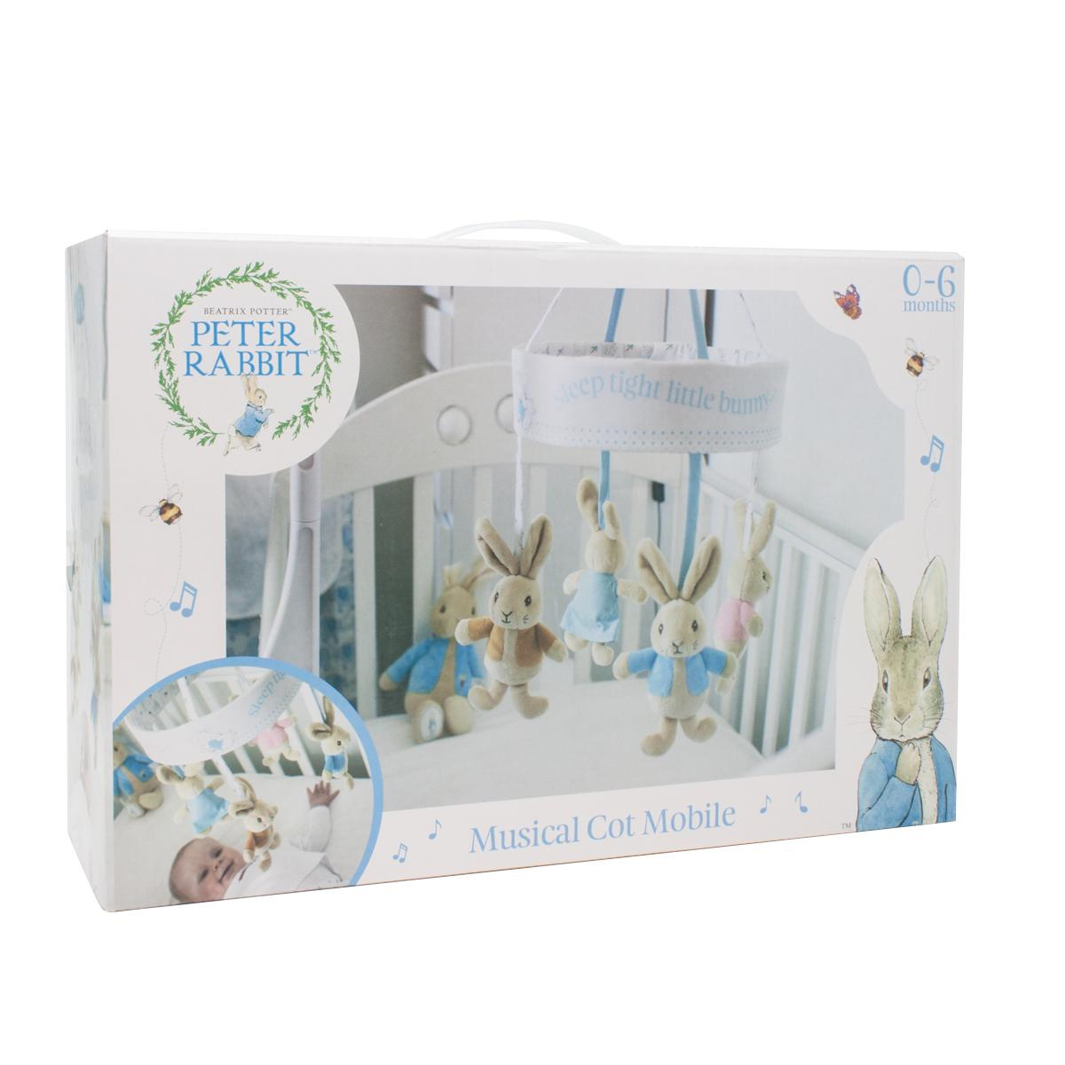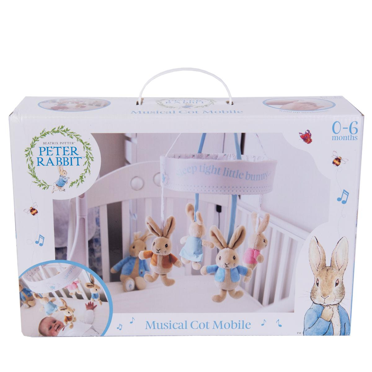 Nádherný hudební kolotoč nad postýlku, který přehrává melodii „Sleep tight little bunny“. Obsahuje čtyři postavičky z původních příběhů Beatrix Potterové. Králíček Petr, králíček Flopsy, králíček Benjamin a králíček Cotton Tail. Držák kolotoče je součástí balení.