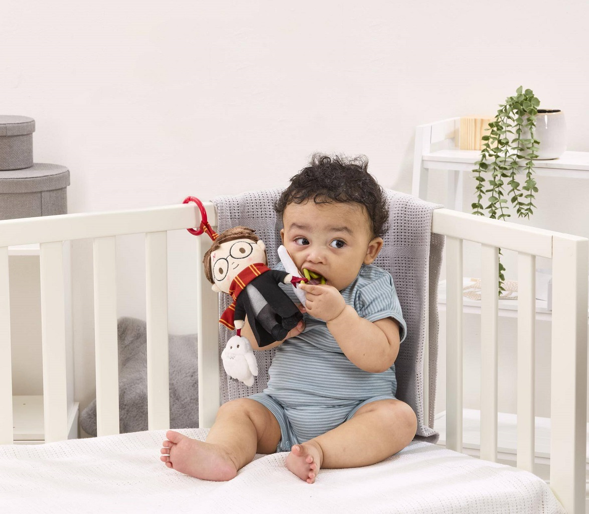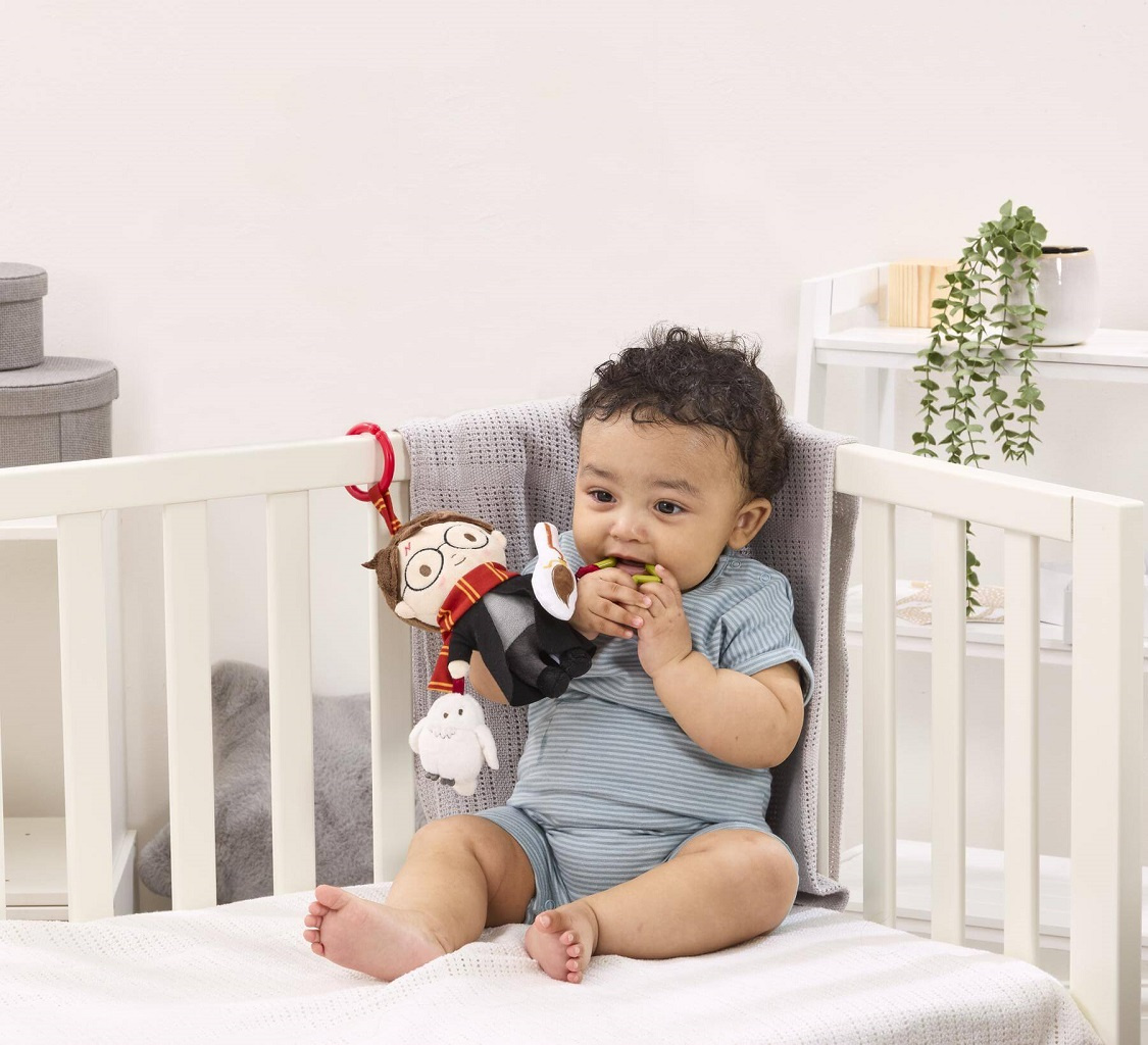 Plyšový kamarád s kousátkem a chrastítkem a pískající sovou! Je čas na kouzelná dobrodružství s Harrym Potterem! Tato zábavná závěsná hračka byla navržena tak, aby stimulovala smysly dítěte a podporovala hru v raném vývoji. Plyšový Harry Potter s kousátkem ve tvaru hvězdy má své typické kulaté brýle a jizvu po blesku, je oblečen do bradavické róby a na krku má barevný nebelvírský šátek. Harryho doprovází také jeho věrné koště Kulový blesk, které vydává jemný chrastivý zvuk, a jeho věrná společnice sova Hedvika, která při stisknutí píská. Hračku je snadné připevnit na kočárek, postýlku nebo autosedačku. Je proto ideální nejen na doma, ale i pro kouzelné chvíle na cestách. Je skvělým dárkem pro nejmladší čarodějnice a čaroděje.
