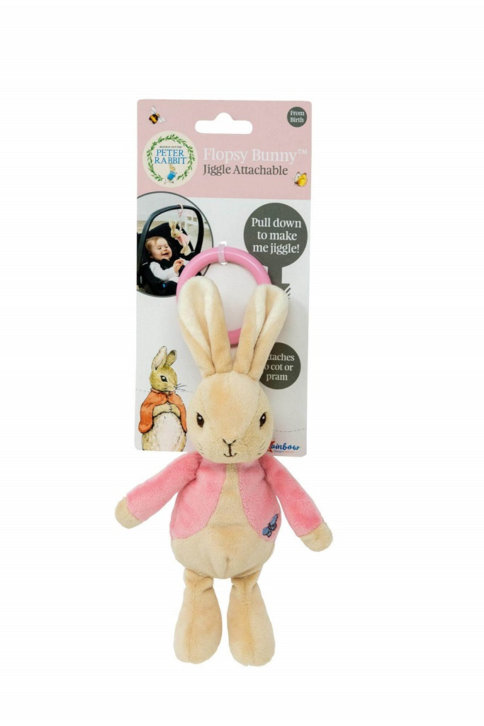 Sledujte, jak se králíček Flopsy třese... Hračka je navržena tak, aby dítě zabavila, je zábavná, měkká a poutavá. Má ideální velikost pro malé ručičky, které ji mohou uchopit a stáhnout dolů. Pak sledujte, jak se děti chichotají smíchy, když se králíček Flopsy třese cestou zpátky nahoru. Hračka je dodávána s připojitelným kroužkem, takže je ideálním společníkem na cesty. Hračku lze snadno připevnit ke kočárku, autosedačce nebo k postýlce.
