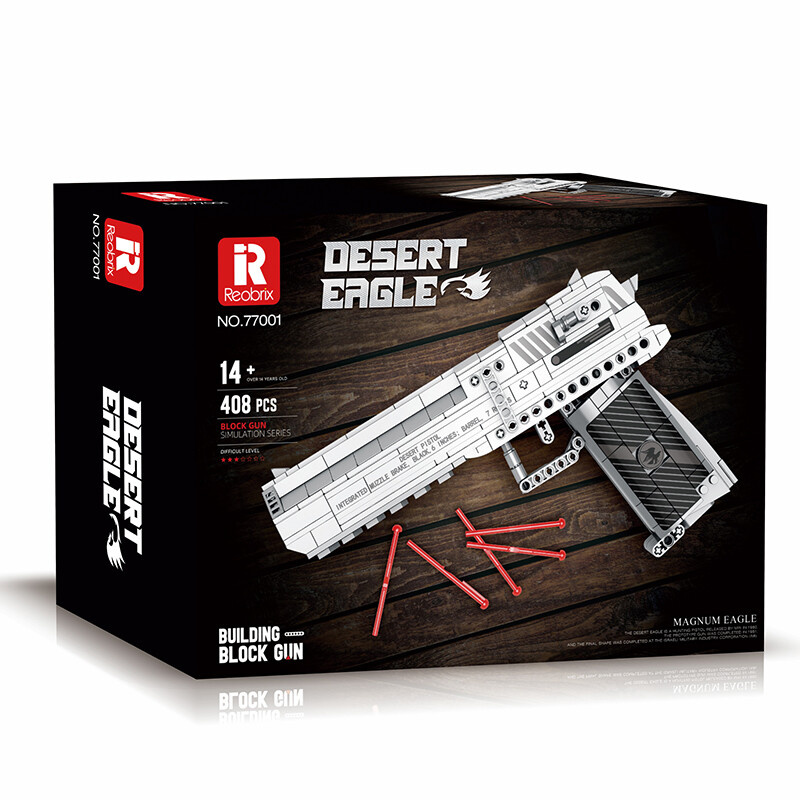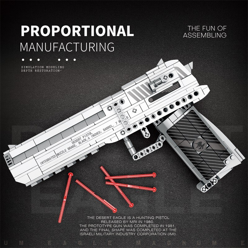 Model je složen z 408 dílků a po sestavení měří přibližně 26 × 5 × 17 cm. Díky precizní konstrukci a autentickým detailům připomíná vzhled skutečné pistole Desert Eagle, která je známá svou robustní konstrukcí a ikonickou siluetou. Stavebnice je ideální pro fanoušky technických modelů, sběratele i milovníky akčních her.