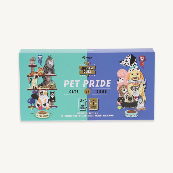 Inovativní soutěživá hra. Vrhněte se do souboje s touto logickou puzzle hrou s motivem svého oblíbeného mazlíčka. Návod ke hře: Vy i váš kolega luštitel máte ke hře 70 dílků skládačky, ale pozor! Existuje pouze jeden poslední oboustranný dílek, který se hodí do obou puzzlí. Nejprve si vyberte puzzle se svým oblíbeným domácím mazlíčkem, psem či kočkou, a začněte skládat. Vítězí ten, kdo jako první poskládá ze svých dílků zvířátka a poté jako první uchopí poslední dílek. Dodáváno s obrázkovými návody a dřevěným stojánkem na poslední oboustranný dílek Hlavní vlastnosti: FSC papírpotištěno netoxickými barvami na bázi vodypro dva hráčeunikátní puzzle hra Značka a certifikát FSC® (Forest Stewardship Council) zaručuje, že dřevo, ze kterého byl produkt vyroben, nebylo vytěženo nelegálně a pochází z lesů obhospodařovaných šetrným či přírodě blízkým způsobem, ve kterém jsou dodržovány přísné environmentální a sociální požadavky. Značka FSC® na výrobku znamená, že svým nákupem pomáháte chránit lesy a podporujete šetrné, odpovědné či přírodě blízké hospodaření, díky kterému jsou naše lesy stabilnější, zdravější, mají přirozenou druhovou skladbu a lépe odolávají negativním následkům klimatických změn.