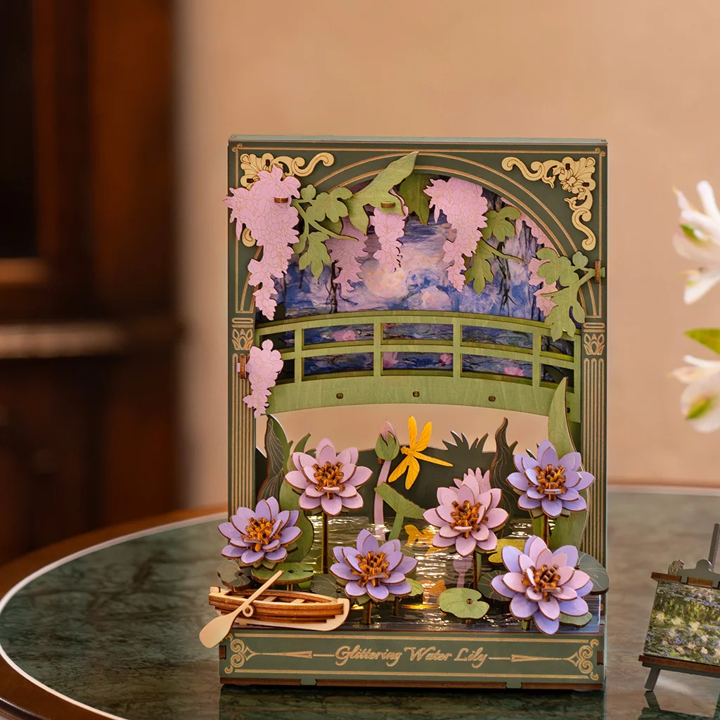 Užijte si netradiční ztvárnění klasických Monetových maleb prostřednictvím 3D skládačky. Třpytivé lekníny vytvoří po sestavení kouzelnou dekoraci s příjemným teplým osvětlením, která ozdobí každý interiér. Celá scenérie s detailně propracovanými květinami, loďkou a dřevěným můstkem navodí atmosféru klidu a pohody. Decentní LED podsvícení dodává dekoraci magickou atmosféru a připomíná hru světla při západu slunce, tolik typickou pro Monetova díla. Složenou scenérii můžete využít jako noční světlo, doplněk do knihovny nebo originální dárek pro každého, kdo má rád umění a tvoření.