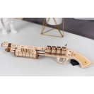 Do zbraně! Stavebnice brokovnice z překližky. Detailně provedná, nabízí možnost střílet přibalenými gumičkami na figurky, které jsou součástí stavebnice. Gumičky dokáže střílet s rozptylem po dvojicích, až do vzdálenosti osmi metrů. Okouzlí všechny malé ochránce spravedlnosti. Skládačka je dodávána v nesloženém stavu, balena v krabici. Vybaveno detailním návodem k sestavení.