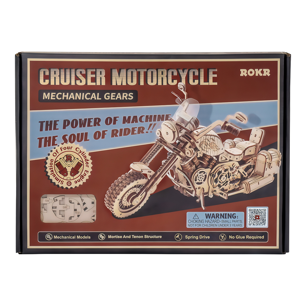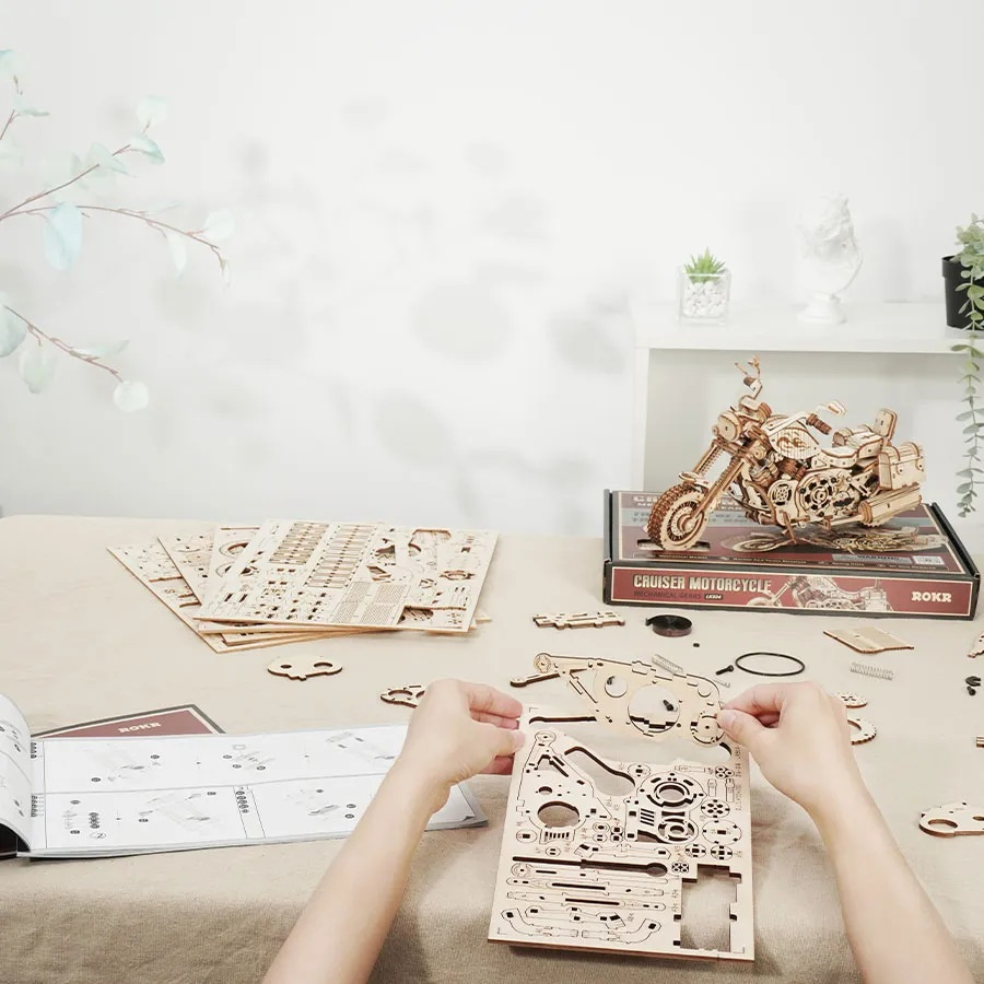 Stavebnice těžkého cestovního motocyklu vyrobená z překližky, je určená všem, kdo sní o bezstarostné jízdě divokým západem. Model je vybaven natahovacím pružinovým strojkem vybaveném spouští, díky němuž je schopen svižné jízdy. Směr je možno částečně ovládat nastavením funkčních řídítek a chod motoru je přitom poutavě ztvárněn pohybem pístů. Motorka zaujme i dalšími funkčními mechanickými podrobnostmi, odpružením vidlice předního kola, či stojanem, s jehož pomocí dovedně zkrášlí poličku, či stůl ve Vašem pokoji, nebo kanceláři. Po obou stranách sedla je vybavena užitečnými skříňkami, které poslouží hrám, ale je možno do nich uložit i drobnou cennost, nebo vzkaz. Skládačka je dodávána v nesloženém stavu, balena v krabici. Vybaveno detailním návodem k sestavení.