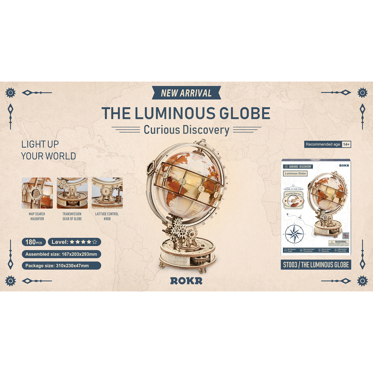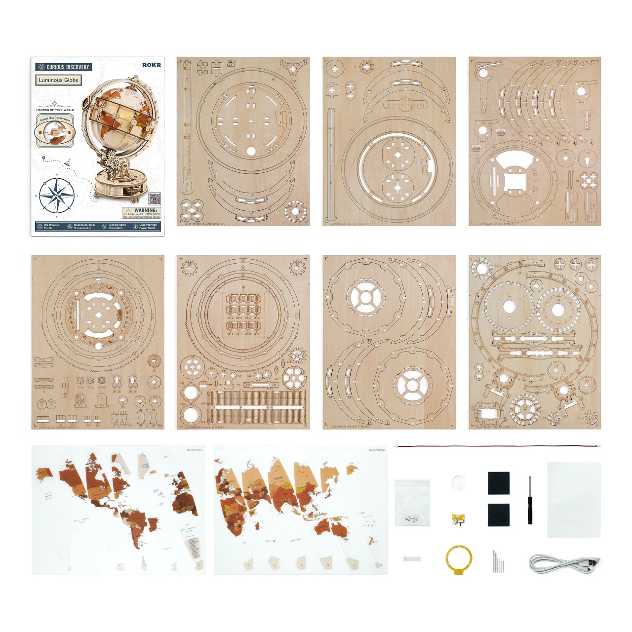 Díky stavebnici glóbu z překližky se neztratíte ve světě, a to ani v noci! Prostřednictvím jeho stavby můžete dát odpočinout své mysli od každodenního shonu, prověřit své dovednosti, trpělivost a schopnost soustředění. Výsledný model můžete využít jako atraktivní noční lampičku, pro tento účel je uvnitř vybaven LED světelným zdrojem o nízké spotřebě, s nenápadným vypínačem a napájením v podobě rozšířeného microUSB, či USB‑A konektoru. Glóbem je možno otáčet prostřednictvím částečně odhalené a poutavě zpracované soustavy převodů. Na svém obvodu je opatřen také mechanicky ovládanou lupou, s pomocí které přečtete i nejdrobnější nápisy na jeho povrchu. Členitá konstrukce je vyvedena v retro stylu, zdobí ji četné ornamenty, ale také stupnice k určování zeměpisné polohy, nebo označení časových pásem. Skládačka je dodávána v nesloženém stavu, balena v krabici. Vybaveno detailním návodem k sestavení.