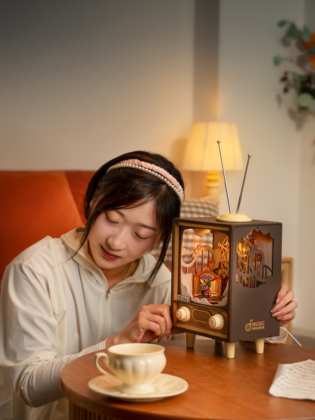 Jste na prahu dobrodružství, které vás vrátí zpět do dětství, do doby, kdy jste byli plni snů a fantazie. Vítáme vás na "Karnevalu při západu slunce", kde zlatý západ slunce a zasněný zábavní park vytvářejí okouzlující scénu právě pro vás. Tato kreativní hrací skříňka (AMT01) s tématem zábavního parku, který využívá televizi jako rámec pro vytváření příběhové scény, je nejen hračkou, ale také skvělým řemeslným kusem, který ozdobí jakýkoli obývací pokoj nebo dětský pokoj. Až se ruské kolo začne otáčet, budete se cítit jako na opravdovém karnevalu. Budete sledovat okamžiky radosti a vzrušení, když malý pan Králík začne hrát na trubku a milý pan Medvěd se objeví na kole. Tato stavebnice, která je tvořena 174 dílky, vás zabaví na hodiny a vytvoříte umělecké dílo, které vás bude stále bavit.
