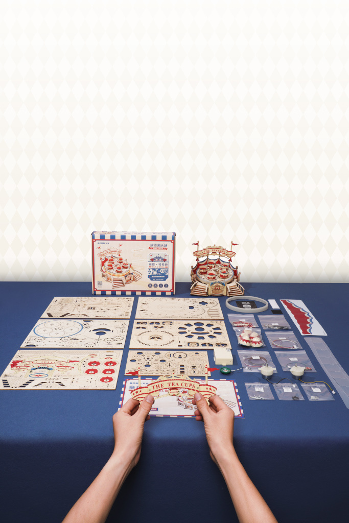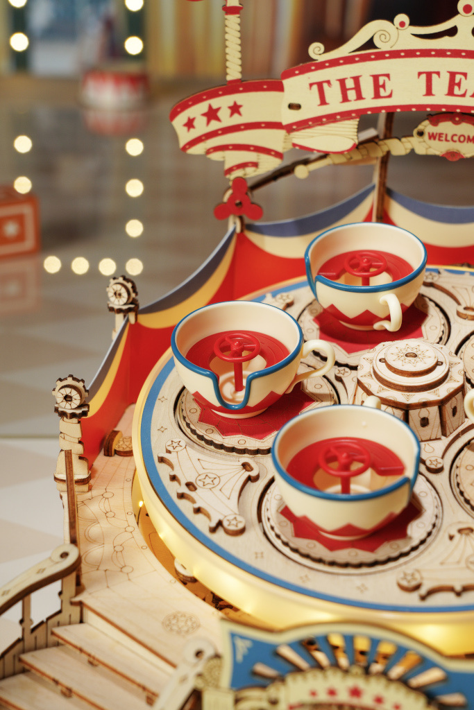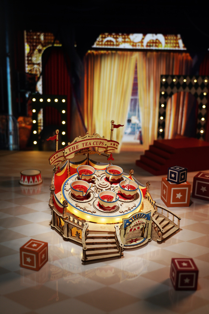 Design vychází z klasických otáčecích kolotočů současných velkých zábavních parků s vnější výzdobou cirkusového stanu z 18. století. Celkový tvar této dřevěné 3D stavebnice připomíná jeviště, které obepínají dva závěsy červené a modré barvy. Za klasickou atmosférou napůl otočného schodiště stojí vysoký otočný podvozek v úhlu. Po zapnutí napájení se pak obrovský podvozek otáčí a mezi světly se pravidelně otáčí i pět šálků. Dotekovým ovládáním lze zvlášť kontrolovat jeho pohyb a zvuk. Dodáváno v nesloženém stavu, baleno v krabici spolu s detailním návodem k sestavení.