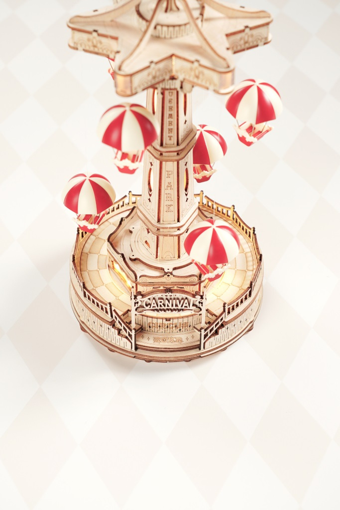 Designér se nechal inspirovat klasickou atrakcí padákové věže ve skutečném zábavním parku a upravil ji tak, že zvedání padáku probíhá stupňovitě nahoru a dolů. Šestiúhelníková základna kopíruje tvar stropu a boční okna jsou vyrobena z průsvitných materiálů, která mohou propouštět teplé světlo a poskytují plný pocit atmosféry. Celkem jsou zde tři světla. Kolotoč je poháněn bateriově napájeným (baterie nejsou součástí balení) motorkem a osvětlen pomocí LED. Dotekovým ovládáním lze zvlášť kontrolovat jeho pohyb a zvuk. Dodáváno v nesloženém stavu, baleno v krabici spolu s detailním návodem k sestavení.