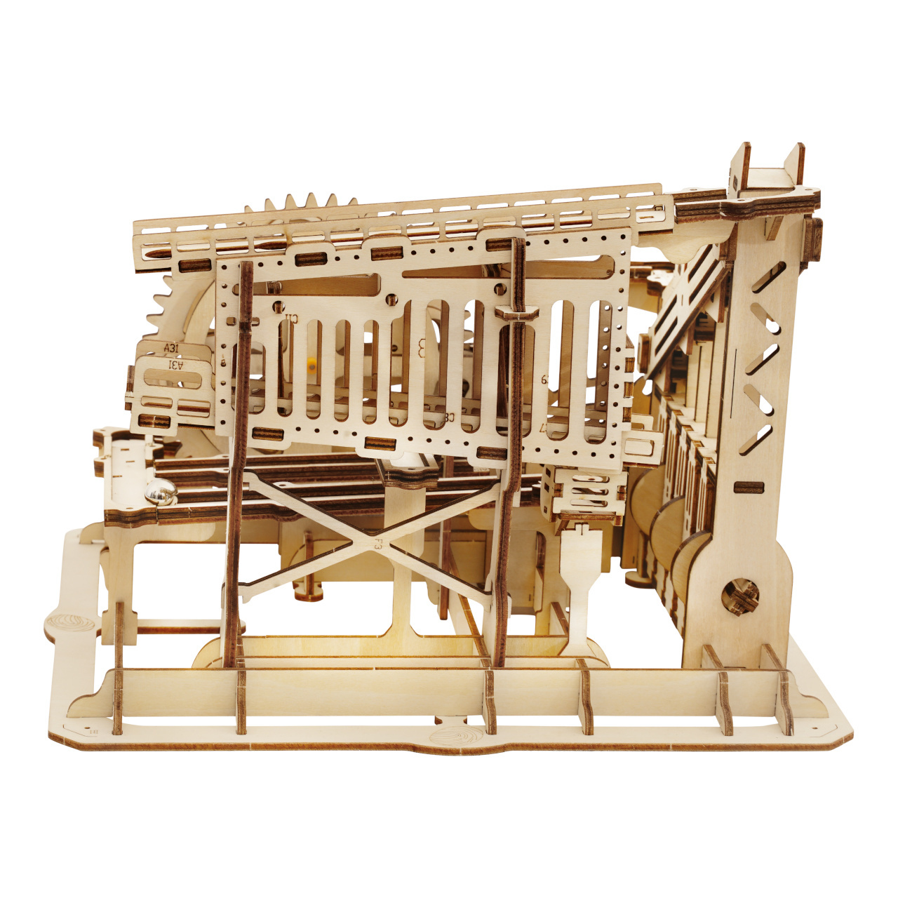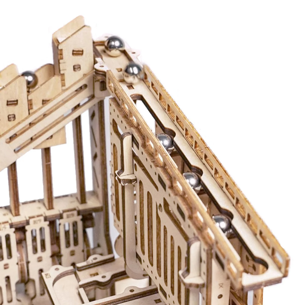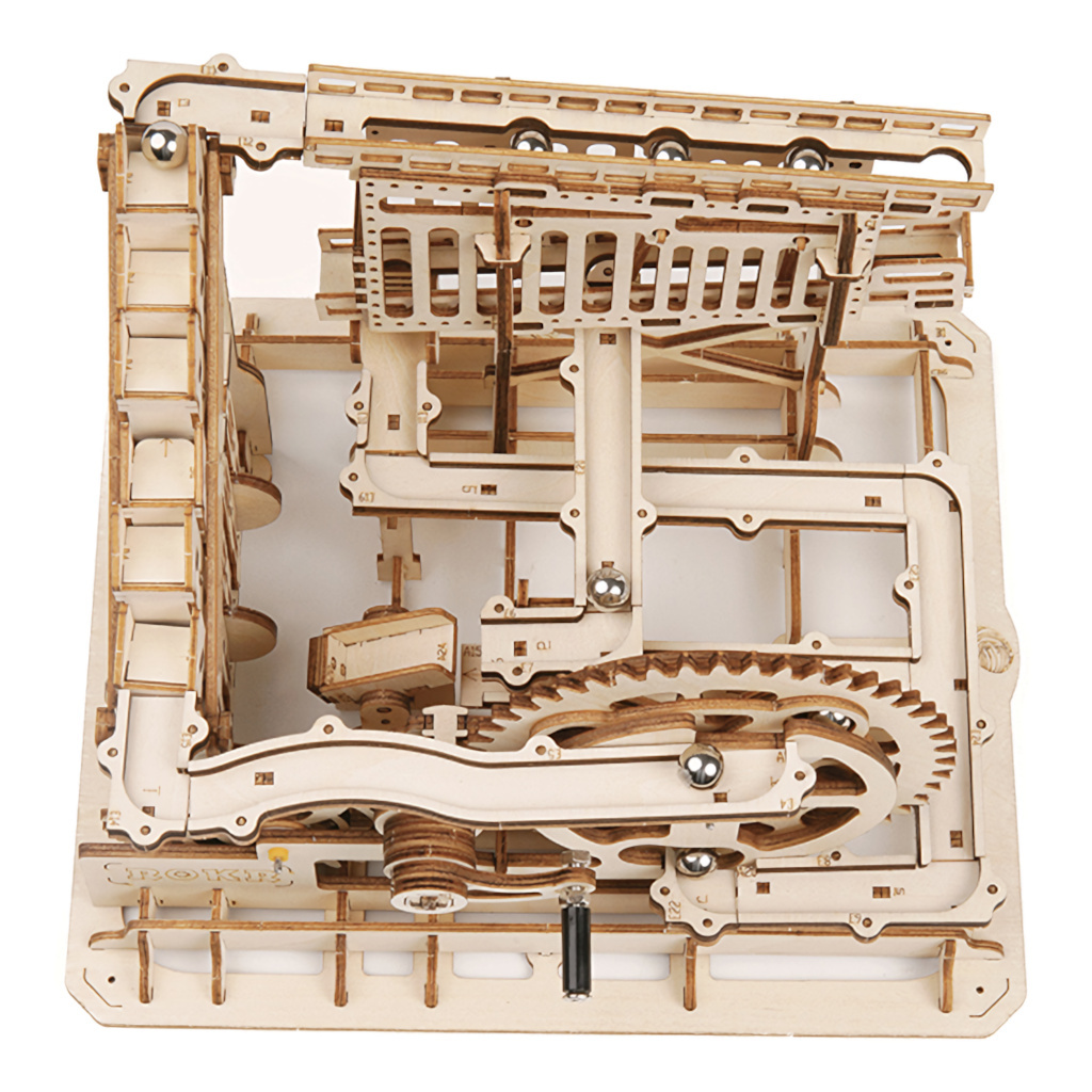 Kuličková dráha se schodišťovým výtahem a sérií propadlišť. Skládačky kuličkových drah Robotime nabízejí jinde nevídané podrobnosti a variabilitu. Každá se může pyšnit originálními funkčními detaily a roztodivnými překážkami, které často nápaditě změní dráhu kuličky, a přinášejí tak výjimečnou zábavu. Mechanika je poháněna ručním pohonem, otáčením klikou, kterým jsou také vynášeny a na cestu pravidelně spouštěny kuličky. Skládačka je dodávána v nesloženém stavu, balena v krabici. Vybaveno detailním návodem k sestavení.