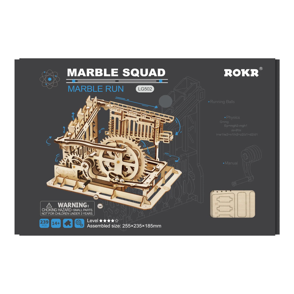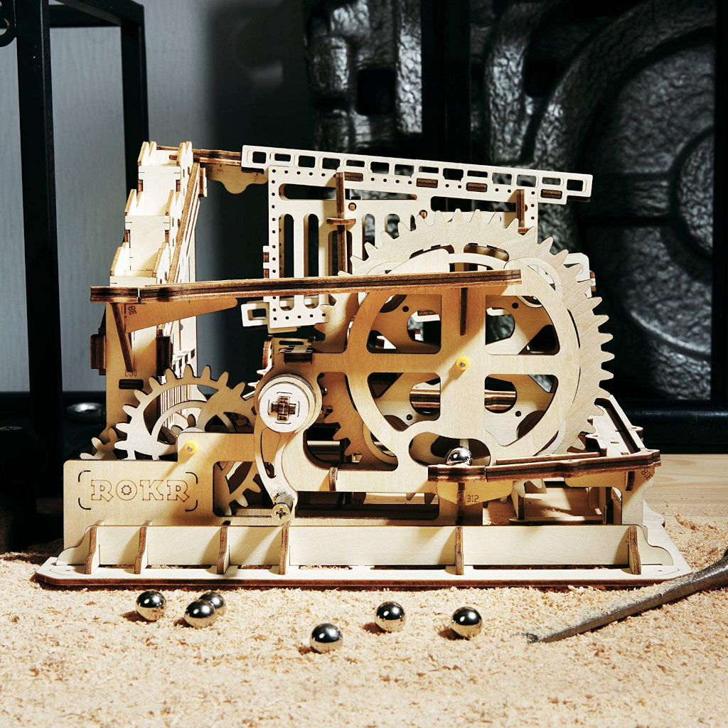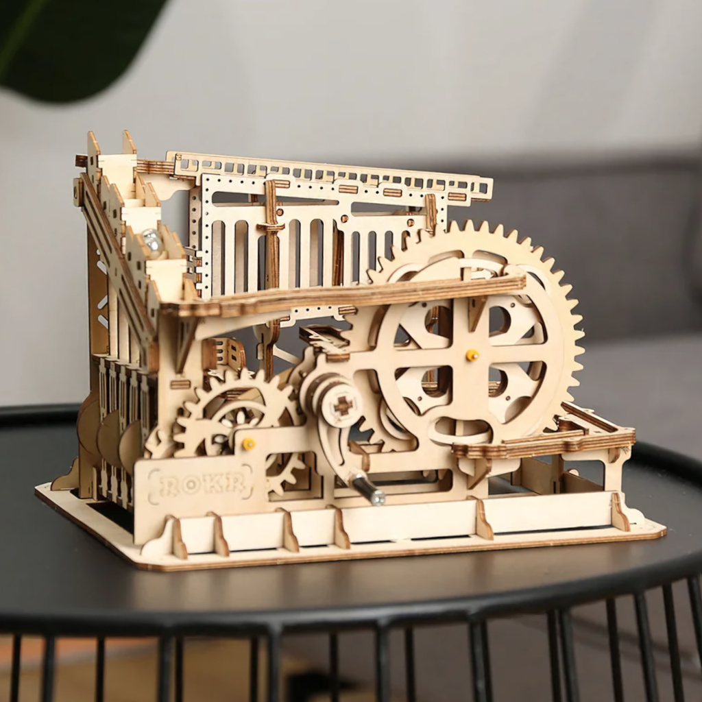 Kuličková dráha se schodišťovým výtahem a sérií propadlišť. Skládačky kuličkových drah Robotime nabízejí jinde nevídané podrobnosti a variabilitu. Každá se může pyšnit originálními funkčními detaily a roztodivnými překážkami, které často nápaditě změní dráhu kuličky, a přinášejí tak výjimečnou zábavu. Mechanika je poháněna ručním pohonem, otáčením klikou, kterým jsou také vynášeny a na cestu pravidelně spouštěny kuličky. Skládačka je dodávána v nesloženém stavu, balena v krabici. Vybaveno detailním návodem k sestavení.